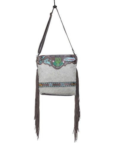 The standout feature? That hand-tooled pannel. It's rich with southwestern flair—bright colors, tooled textures, and charming motifs like cacti, feathers, and floral accents, all beautifully painted and stitched. It feels a little vintage, a little modern, and totally unique. Just below, soft hair-on-hide brings a cozy, natural texture that makes each bag one-of-a-kind. The contrast between the two is where the magic really happens.