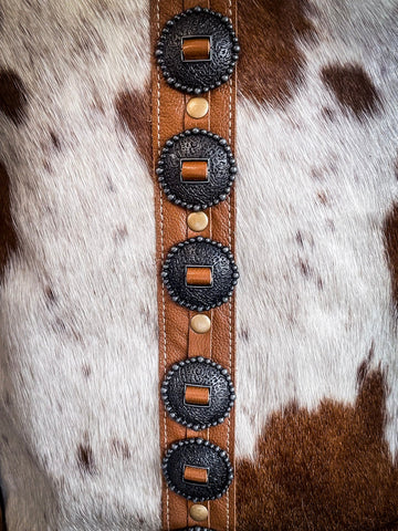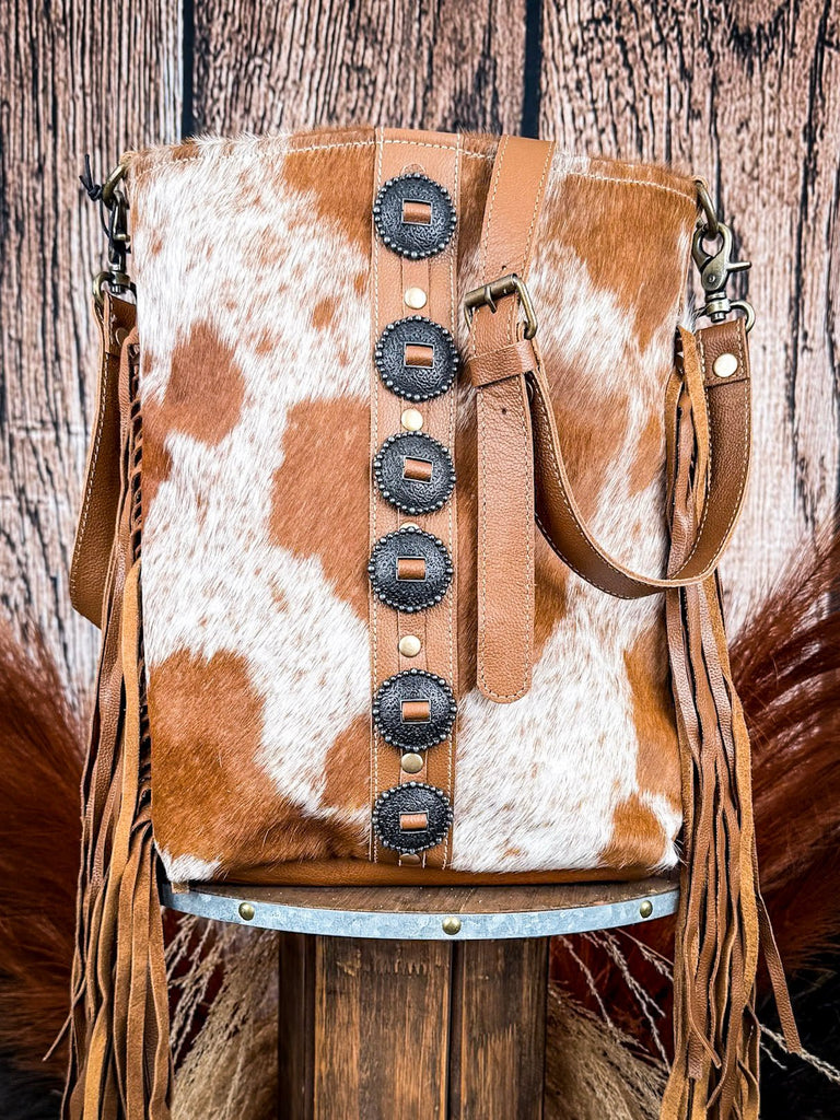 Crafted from genuine hair-on-hide, each bag is a little different, and that’s what we love about it. The hide front features a center leather panel with vintage concho accents running down the middle—bringing that rugged, well-traveled feel to the forefront. It’s got just enough detail to catch the eye, with a layout that stays clean and easy to wear.