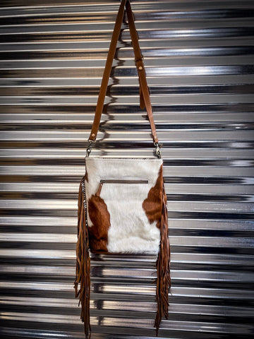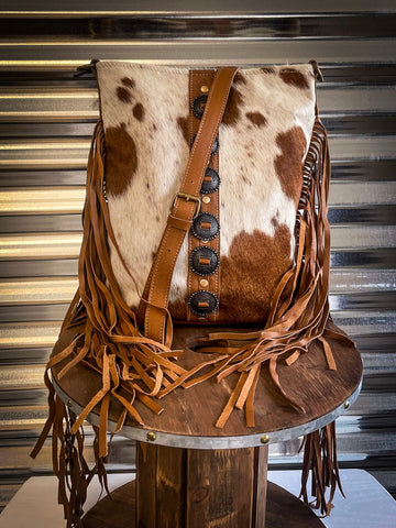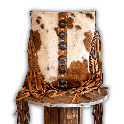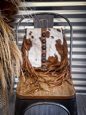 Looking for a statement piece that turns heads without trying too hard? The Flouncy Leather and Hair-On-Hide Crossbody Bag is exactly that. With bold natural hide, western fringe, and vintage-inspired concho details, this beauty brings texture, movement, and attitude to any outfit—while keeping things functional and grounded.