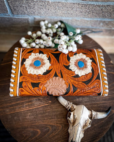 At first glance, the Paean Wallet enchants with its vibrant hand-tooled leather exterior. Two beautifully carved ivory flowers with turquoise centers are surrounded by flowing leafwork, set against a warm, multi-toned background. A silver concho accent at the center adds a hint of classic Western charm, while the scalloped flap edge is bordered with white whipstitch detailing for a bold, handcrafted finish.