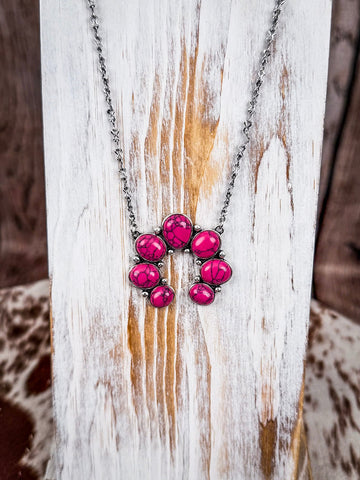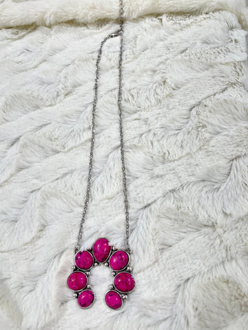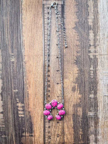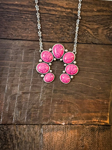 This necklace is made to stand out. A 1.5” statement pendant anchors the piece with that classic squash blossom silhouette, but instead of playing it safe, they went full throttle with hot pink faux stones. Each one is framed in silver toned metal with natural veining throughout, giving the illusion of authentic stone without the heavy price tag. The color is rich, the energy is high, and the finish is clean and crisp.