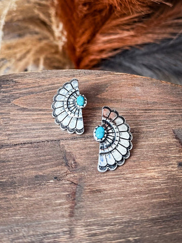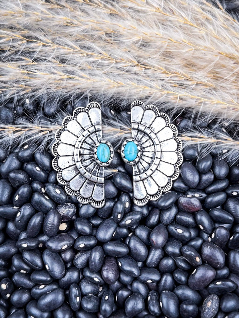 Crafted in an antique silver-tone finish, each earring fans out like rays of light or the soft sweep of desert wind, creating a silhouette that’s bold yet graceful. The etched detailing along the edges adds depth and texture, making them feel like a cherished heirloom passed down with love and worn with pride. At the heart of each stud sits a faux turquoise stone—vivid, vibrant, and set just right to catch the light and complement your favorite denim, sundresses, and everything in between.
