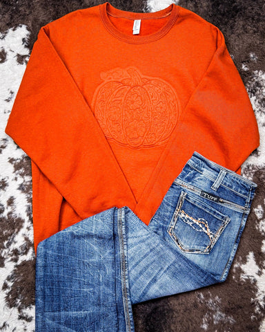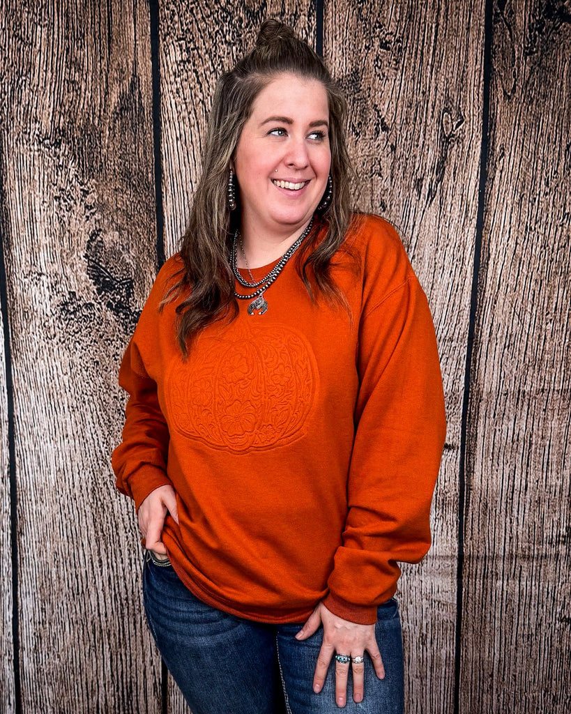 Let’s talk details. That embossed pumpkin front is the star here—raised with a floral tooled design that gives the whole piece texture and depth. It’s understated but eye-catching, perfect for folks who love fall but want something with a little more style than your average seasonal tee. Pair it with denim, turquoise, and boots, and you’ve got an outfit that looks like you spent hours planning it—even if you didn’t.