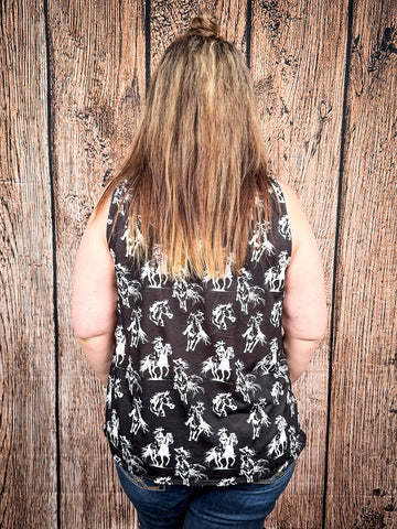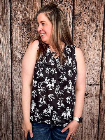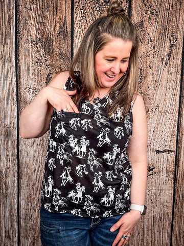 Let your wild side show with the Rebel Riders Tank—a black-and-white statement piece made for gals who’ve never been one to follow the herd. With its bold allover print of galloping horses and rodeo riders, this top brings high-desert energy with an edgy, untamed twist. Whether you're throwin’ on boots or kickin' back in sneakers, this tank’s got attitude and style in spades.