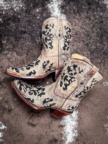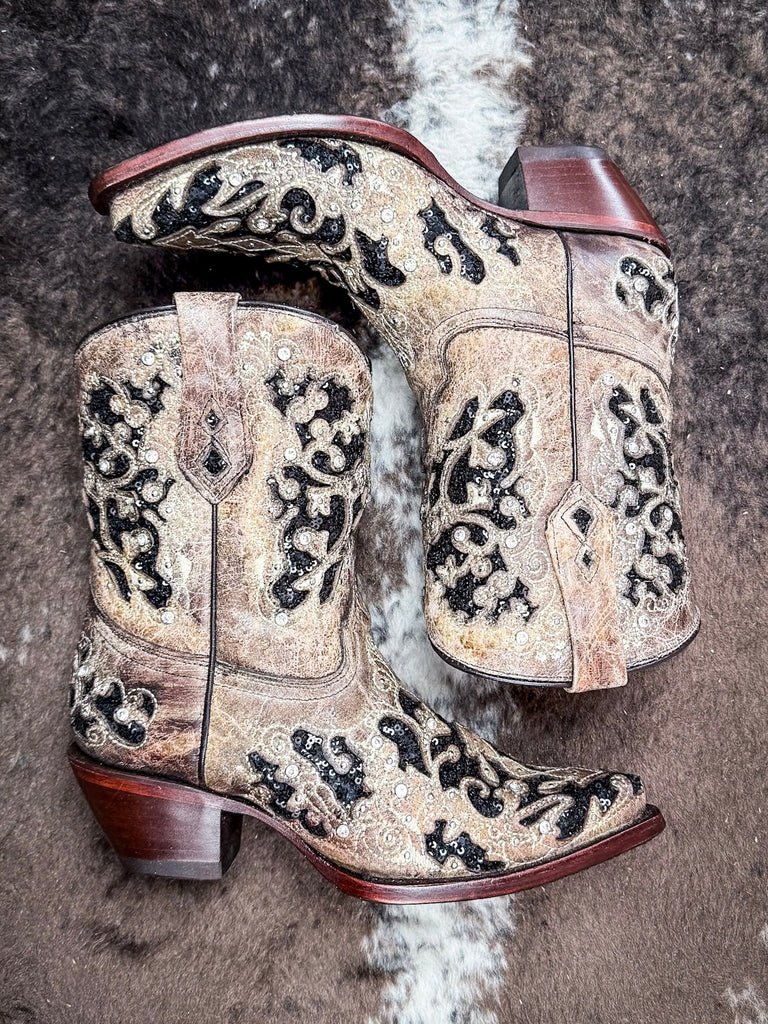 There’s a little mystery in every step. The Shadowlace Corral Boot blends rich texture, striking inlay work, and just the right amount of shimmer to create something unforgettable. With its bold contrast, ornate patterns, and feminine silhouette, this ankle bootie was made for the ones who lead with quiet confidence and undeniable style.