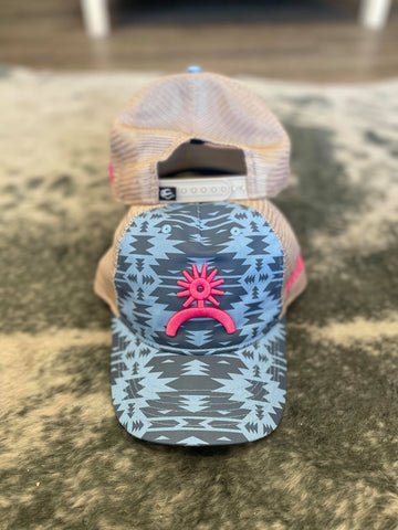 Spur Up Hat - Bozeman is a fun blue Aztec print snapback featuring a bright pink 3D embroidered spur and "Bronco".