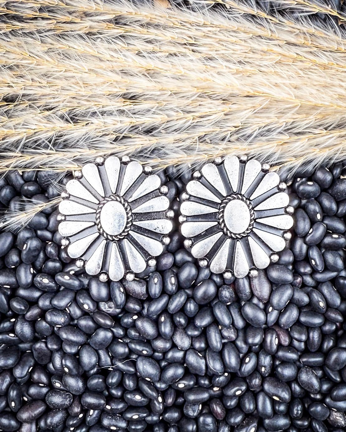 Measuring 1.5 inches across, these earrings are the perfect size to catch the light without stealing the show. The raised oval center is framed by rope-textured detailing, while the petal-shaped spokes add movement and depth. Every detail is carefully crafted to create a layered, dimensional look that feels both rustic and refined.