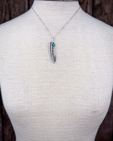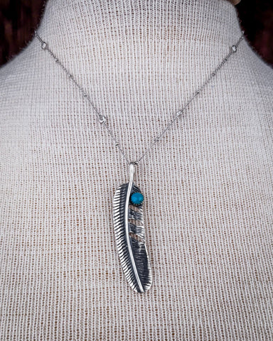 The centerpiece of the Tamia necklace is a detailed feather pendant, crafted from solid sterling silver. Every line is hand-etched, giving it a natural, textured look that captures the soft curve and flow of a real feather. At the base of the quill sits a single round turquoise stone—small but bold, and full of that signature blue-green vibrance that only comes from genuine stone.