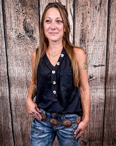 If you’re looking for a tank that checks every box—comfortable, cute, and easy to style—The Lanie Tank in Black is it. Made from a soft waffle knit with subtle texture, this top combines everyday comfort with thoughtful details that make it feel just a little extra. It’s designed with a flattering v neckline, faux button-down front, and a front patch pocket that gives it a relaxed, laid-back charm.