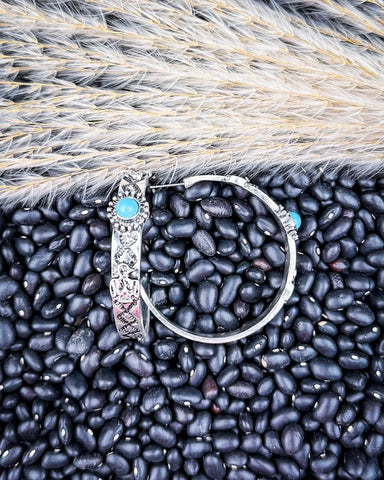 For a laid-back look, pair the Thunderbird Hoop Earrings with a messy bun or low ponytail so the detailing really shows. Going for something more polished? Let them peek out from under loose curls or beachy waves. The turquoise hue works beautifully with neutrals, but also pops against jewel tones like deep burgundy or emerald green.