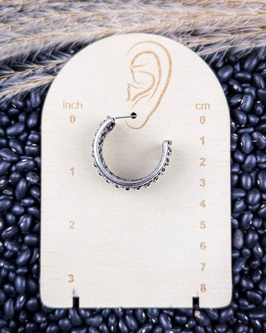 Crafted in a rich, antique silver tone, the Twist & Timber hoops feature a detailed rope-texture twist that wraps around a sculpted, open form. The design is both rugged and refined — a balance of motion and stillness, grit and grace. Inspired by weathered tack, saddle leather, and the braided rope of a seasoned ranch hand, they bring Western heritage into modern light with bold femininity.