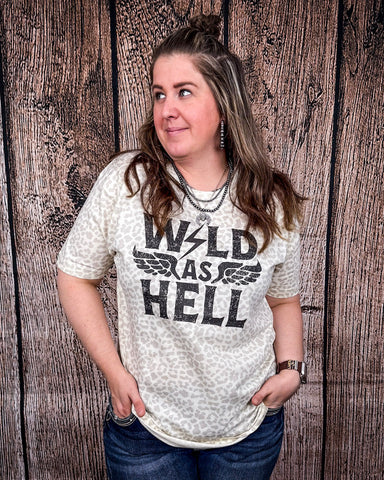 Let’s start with the print—because it’s impossible to miss. The bold “Wild As Hell” statement front and center is flanked by winged graphics and a lightning bolt slash that adds a little extra edge. It's gritty, strong, and just plain fun. And underneath that bold black ink? A snow leopard backdrop that’s subtle enough to layer, but fierce enough to be noticed. The mix of animal print and rocker-inspired lettering is the perfect blend of wild and worn-in.