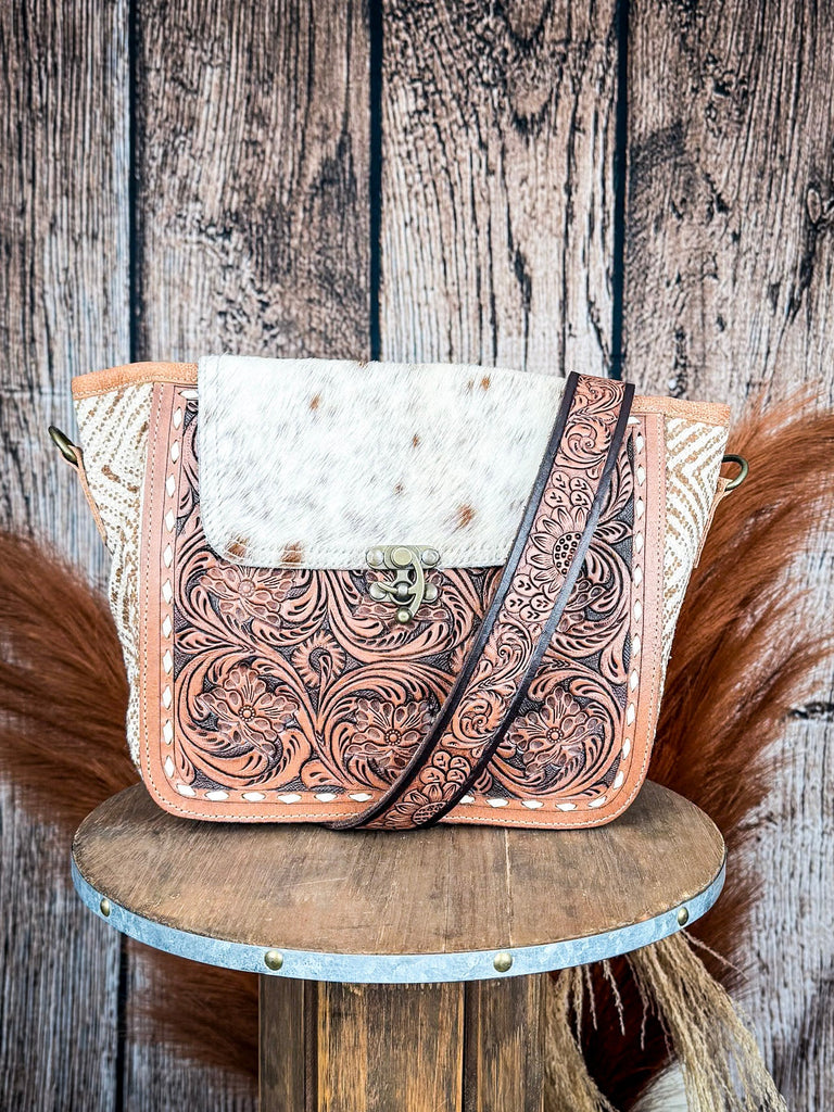 Every detail feels intentional. From the tooled leather front with its swirling floral motif to the bold, geometric canvas panels, this crossbody strikes a balance between raw and refined. It’s got just enough edge to stand out, but it’s grounded in the kind of craftsmanship that holds up to real life. Whether you’re headed to the farmer’s market, a casual dinner, or just out and about doing your thing, the Wild Grace adds that effortless, lived-in touch to whatever you’re wearing.