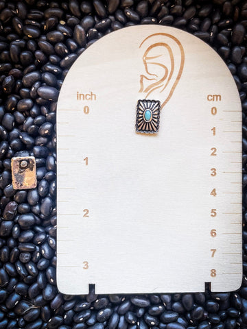 Add a touch of Western elegance with our Windom Stud Earrings. These petite rectangle earrings feature burnished silver conchos adorned with a captivating starburst pattern and a striking piece of faux turquoise at the center. Perfect for adding a touch of Western flair to any outfit, they offer a blend of rugged charm and elegant detail. Ideal for daily wear or special occasions, the Windom Stud Earrings are a must-have accessory for anyone who loves unique, eye-catching jewelry.