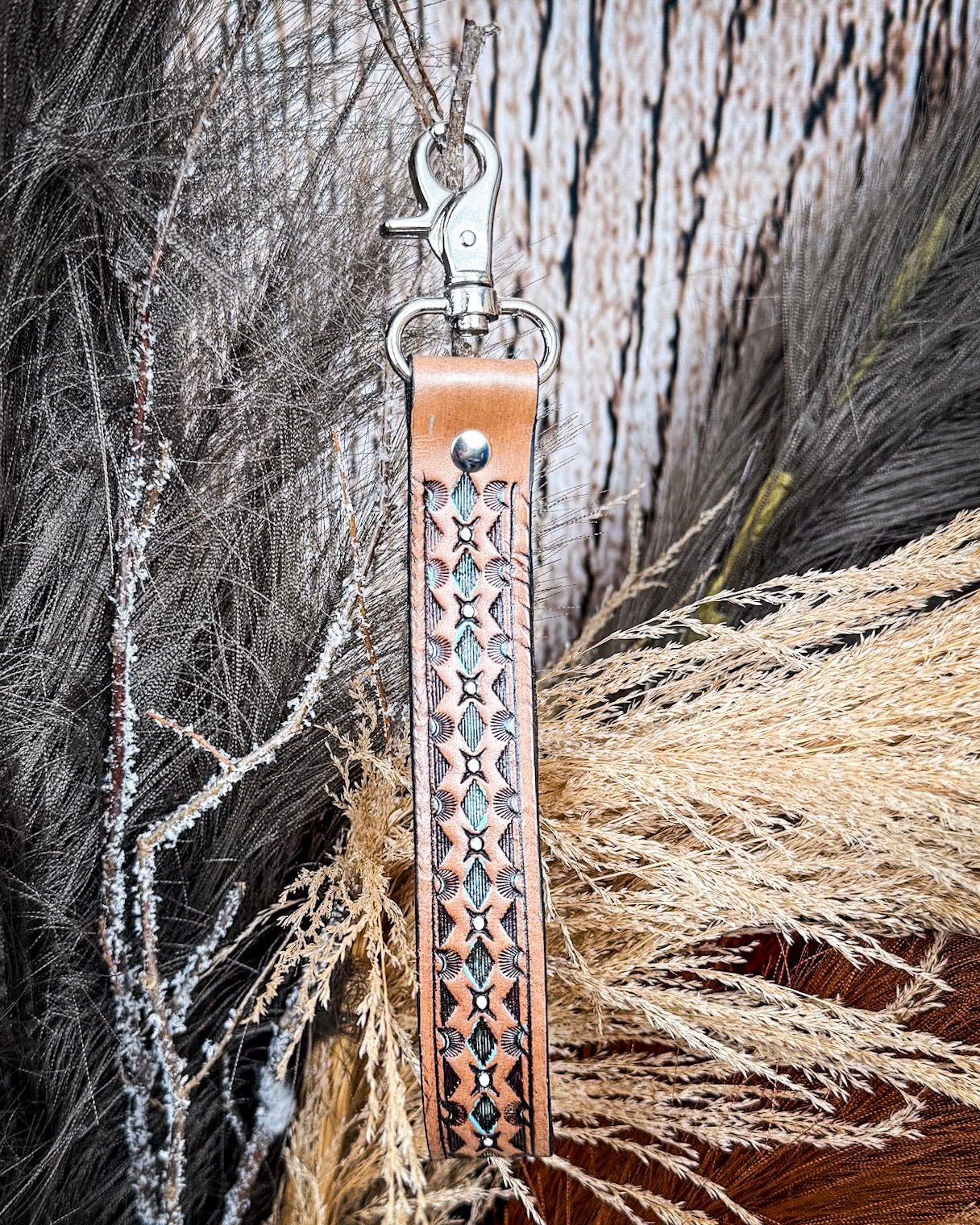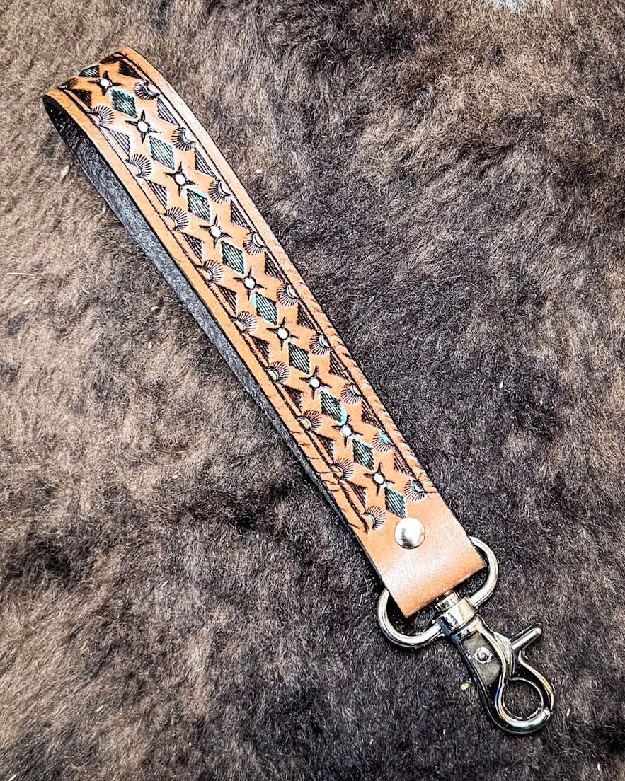 What sets the Canyon Spire Fob apart is its intricately tooled center panel, featuring a traditional Southwestern motif with repeating diamond and starburst shapes. These patterns, inspired by desert mesas and ancient stonework, run symmetrically along the length of the strap, drawing the eye and adding a sense of motion and direction. Turquoise colored accents are carefully placed to contrast against the earthy brown tones, adding a pop of color reminiscent of desert skies and riverbeds. This fusion of natural and crafted elements creates a design that feels rooted yet elevated—modern in use, timeless in spirit.
