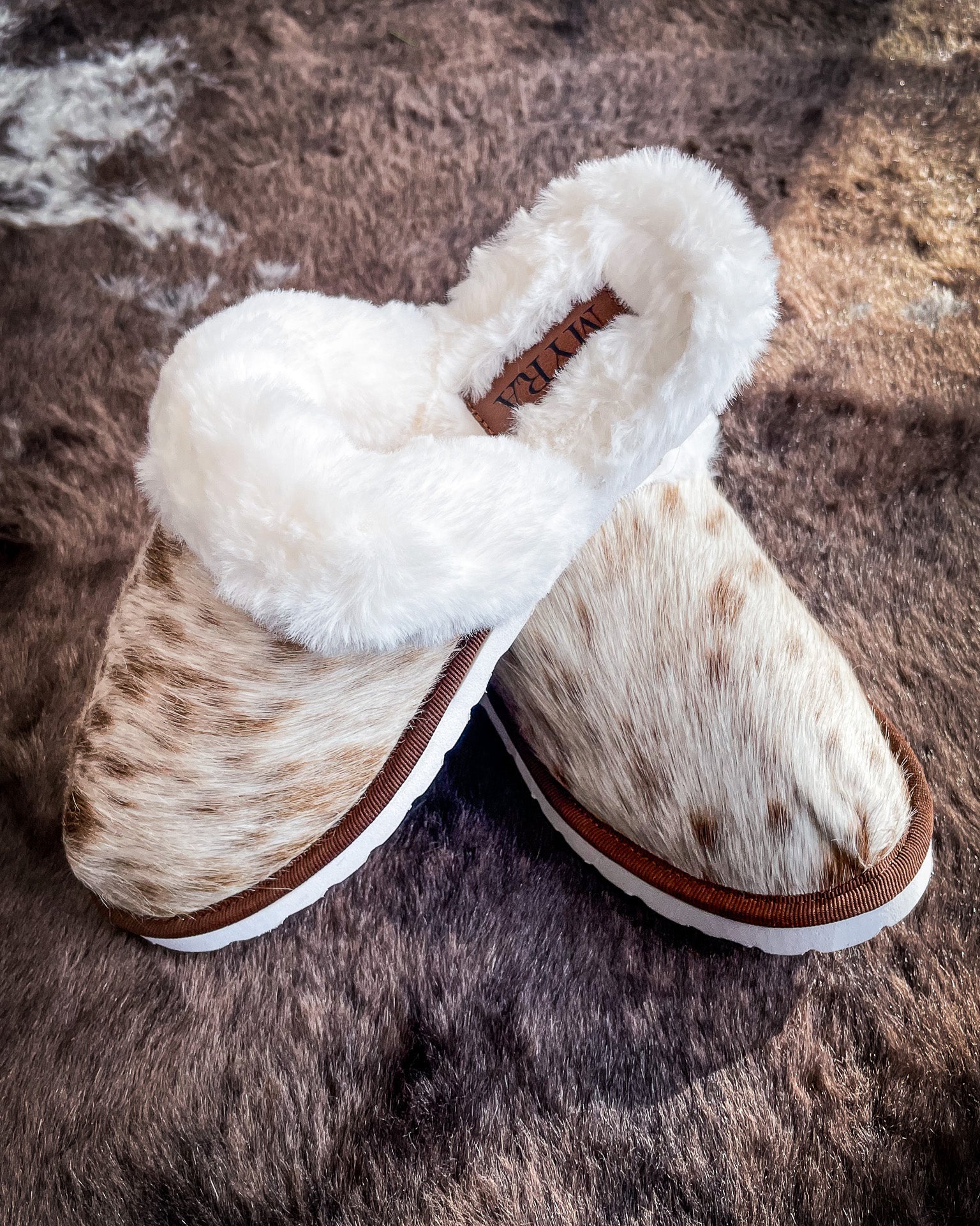 Cozy meets chic in the Myra Homey Scuff Slipper. Crafted with genuine hair-on hide, each pair has its own unique pattern—making your slippers truly one of a kind.