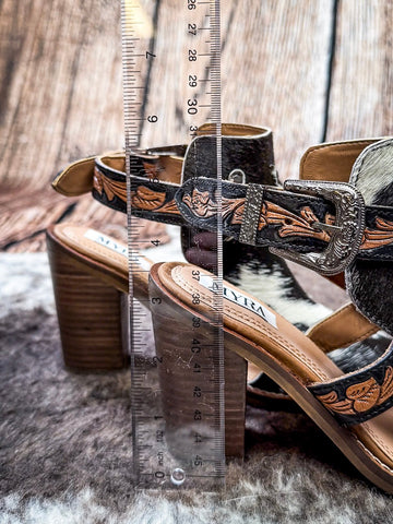 A bold, hand-tooled leather strap wraps around the ankle and across the arch, adorned with intricate tooling that calls to mind heirloom leather saddles and vintage rodeo belts. Secured with silver hardware, these details aren’t just decorative—they're a tribute to craftsmanship that honors tradition while blazing new trails.