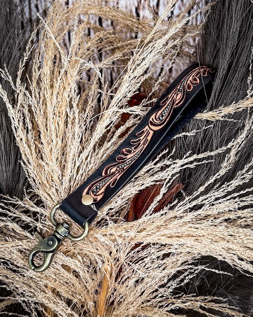 The hand-tooled leather showcases an intricate Canyon Ember scroll pattern—a fiery blend of rustic browns and turquoise—that practically glows against the rich jet-black leather base. Each swirl and flourish channels the craftsmanship of old-world saddle making, bringing with it a story of heritage, grit, and artistry. Whether you're heading into town or hitting the road, this key fob is a subtle yet powerful way to wear the Western lifestyle every day.