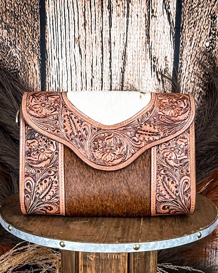 Western elegance meets artisan craftsmanship in the Myra Bag - Copper Charm Hand Tooled Bag in Earthen Hide & White. This eye-catching crossbody combines rich, earthy textures with intricate floral tooling to deliver a timeless piece that’s as rugged as it is refined. Every detail, from the hair-on hide to the hand-tooled leather flap, tells a story of tradition, artistry, and Western spirit.