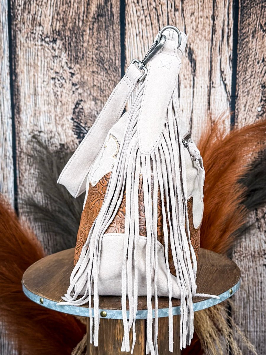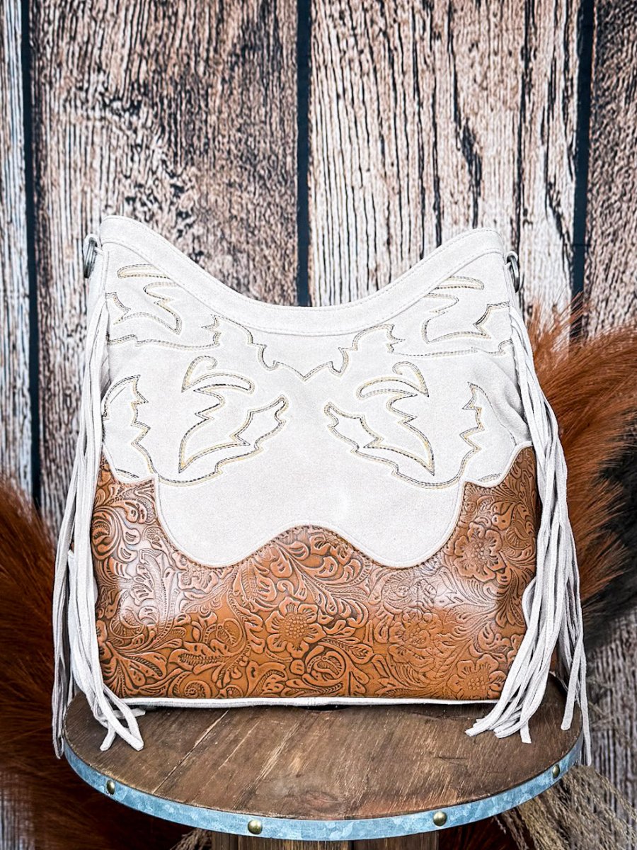 • Bold, detailed, and full of western soul—The Electric Desert Tote is a total showstopper. With rich textures, statement fringe, and tooled leather detailing, this shoulder bag brings high-desert energy to everyday life. It’s equal parts edgy and elegant, made for the gals who like their accessories with a little grit and a lot of charm.