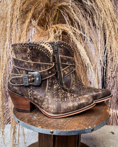 The Haley’s High Peak Booties from Myra Bag are where rugged leather meets modern western style. Built with premium distressed leather and elevated with handwoven detailing, these booties are made to stand out in all the right ways.