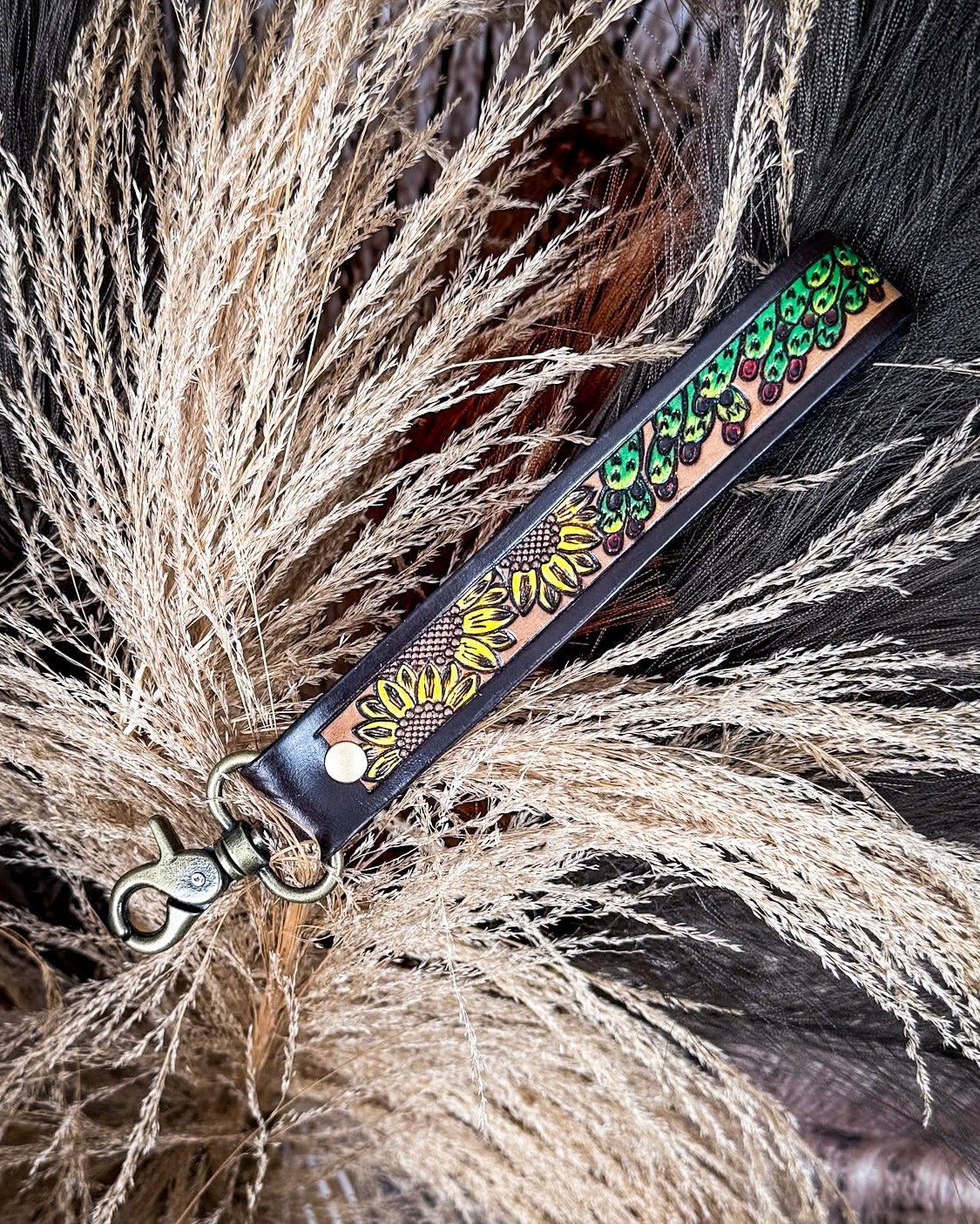 Made from genuine leather, this key fob features intricate hand-tooling that tells a story of rustic charm and artistic expression. The design showcases radiant golden sunflowers entwined with vibrant green cacti, creating a lively contrast against the warm, chocolate-brown leather backdrop. Each bloom and swirl is carefully carved and colored, offering a piece that feels personal, timeless, and rooted in nature’s raw beauty.