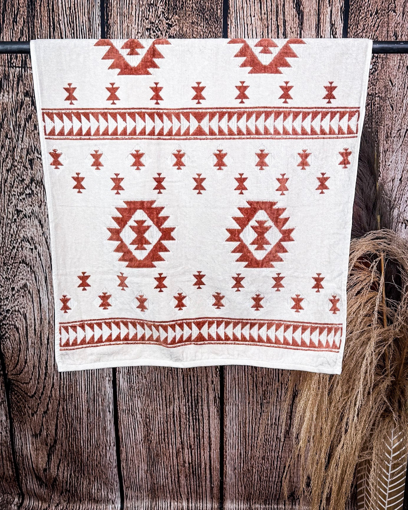 The woven pattern nods to southwestern design with geometric shapes that feel rooted in tradition but still fresh and modern. The color palette is warm, grounded, and totally versatile—easy to blend with neutrals, whites, or even layered with bolder prints if you’re feelin’ a little more eclectic. These aren’t your average bathroom towels. They’re statement pieces that work just as hard as they look good.