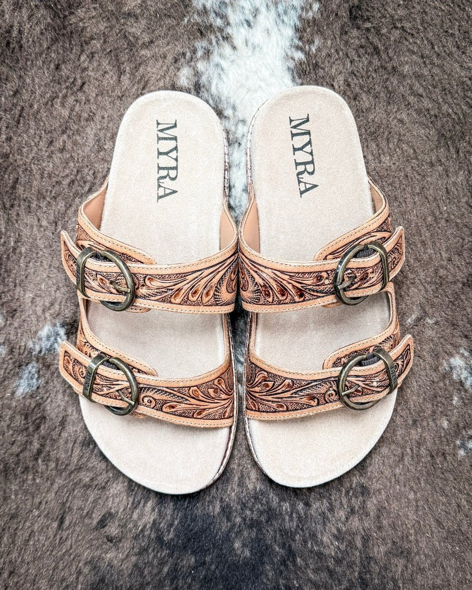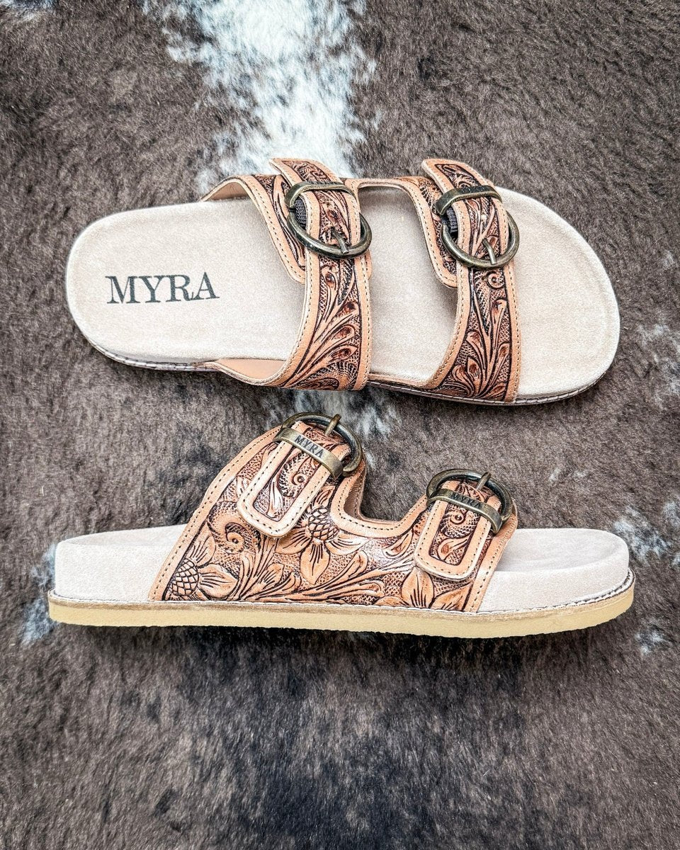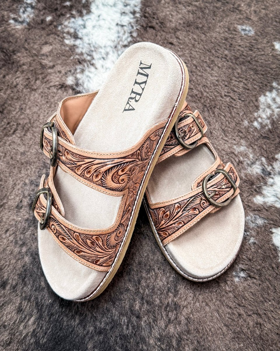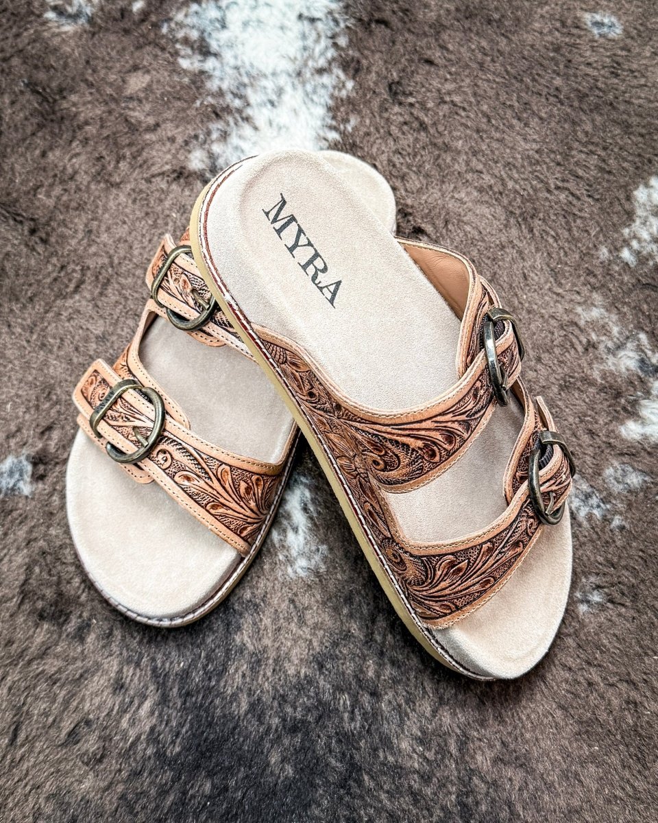 • Meet your new everyday favorite. The Willow Bloom Sandals by Myra Bag are light, versatile, and designed to feel easy from the first step. The genuine leather upper features intricate hand-tooled detailing that brings a quiet Western touch to a simple, wearable slide. Finished in an ashen brown tone, these sandals pair effortlessly with denim, sundresses, and everything in between.