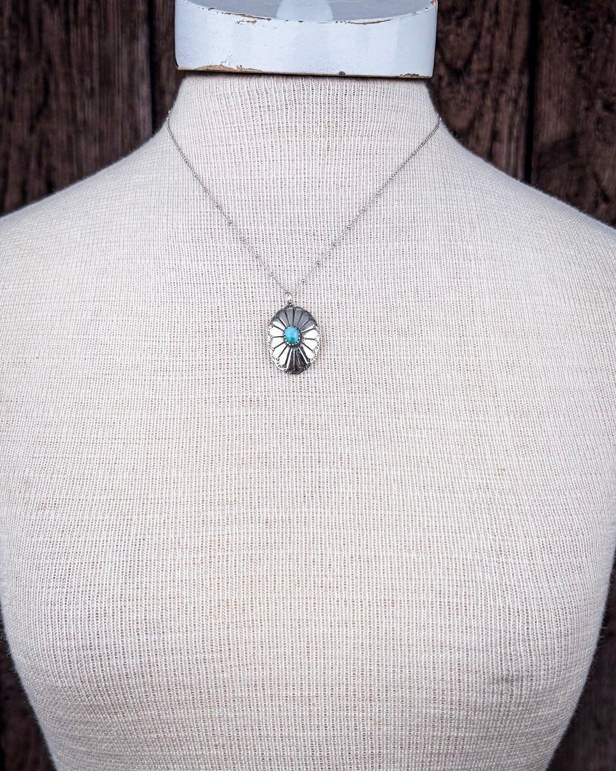 At the center of the pendant is a genuine turquoise stone—each one hand-selected for its natural variation in color and veining. The oval shape sits inside a sunburst-style design that radiates outward with delicate hand-stamped lines and scalloped edgework. It’s a symbol of strength and light, capturing the spirit of wide-open spaces and heritage craft.