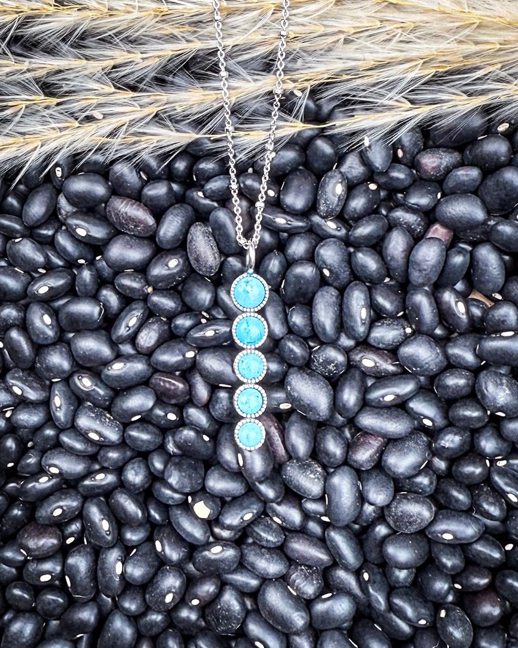 Each turquoise stone is framed in a dotted silver bezel, creating texture and dimension while letting the natural beauty of the stones take center stage. Because these stones are genuine, every pendant has its own one-of-a-kind variations in color and veining—no two are ever exactly alike.