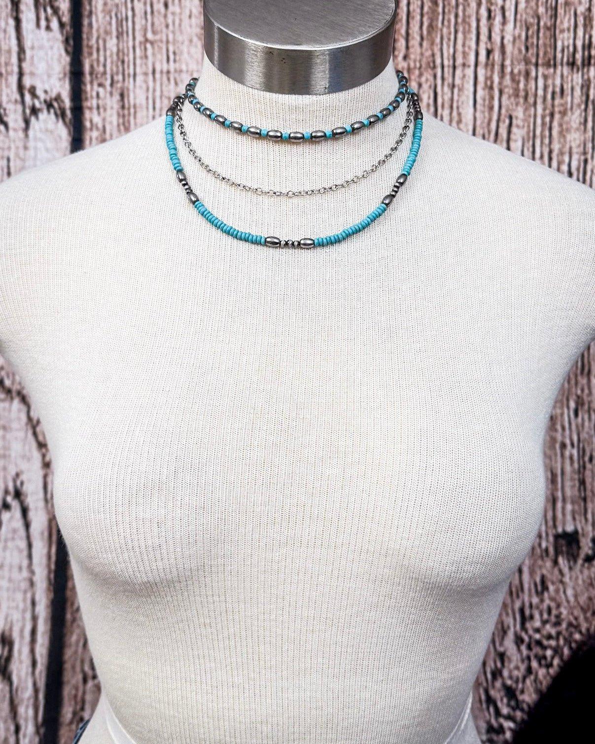Elevate your accessory game with our Faux Navajo Pearl and Chain Layered Necklace, where classic western charm meets modern style. This stunning piece features a beautiful combination of faux Navajo pearls and delicate chain layers, creating a visually captivating look.