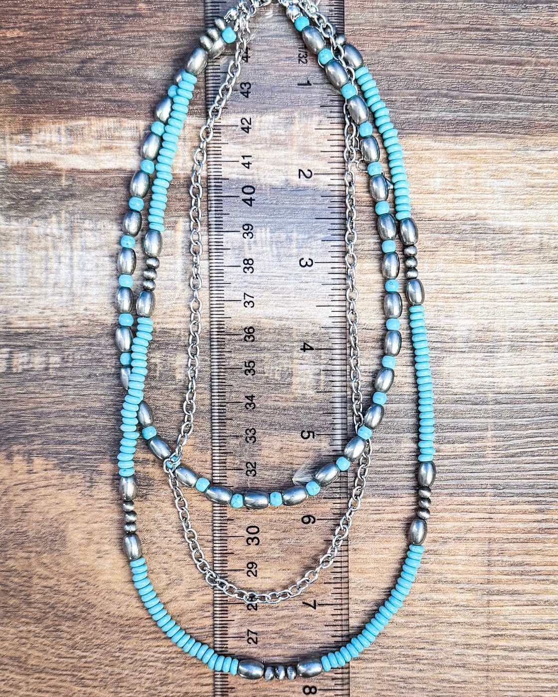 Crafted from high-quality materials, the necklace is lightweight and comfortable, making it ideal for everyday wear or special events. Embrace your unique style and celebrate your love for western aesthetics with this eye-catching Faux Navajo Pearl and Chain Layered Necklace!