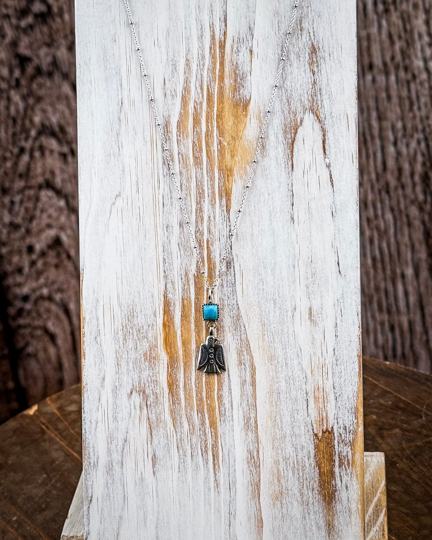 At the heart of this necklace is a hand-finished sterling silver pendant featuring the iconic thunderbird—an ancient symbol of strength, freedom, and protection. The design is detailed but not overdone, giving it a bold yet wearable feel. Just above the bird, a genuine turquoise stone adds that pop of blue we all love—natural, unique, and quietly striking. Each stone will be unique!