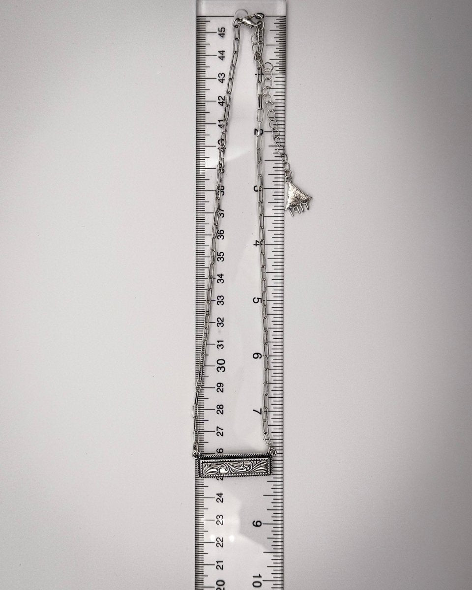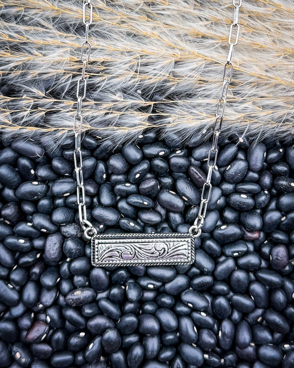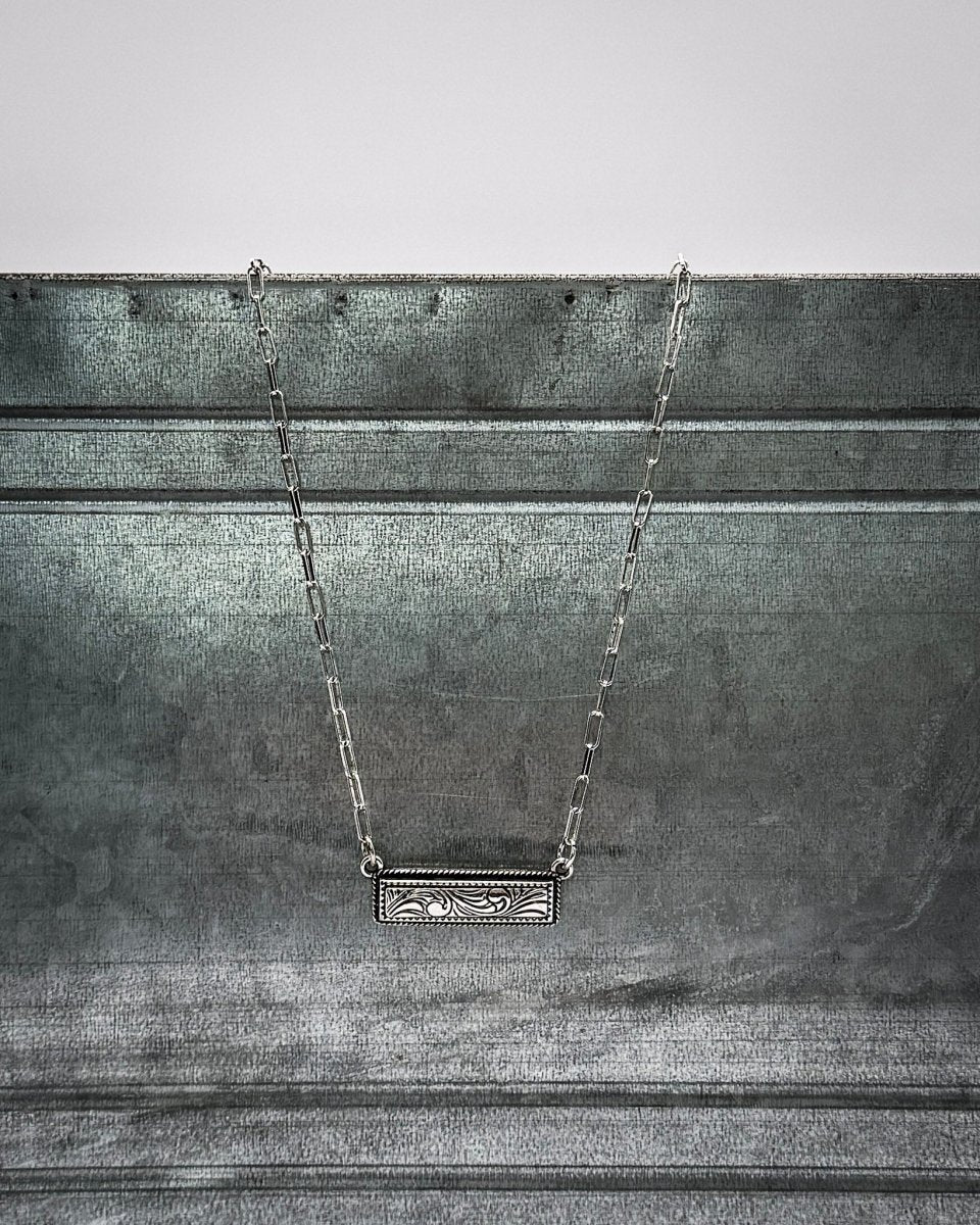The Westforge Scroll Bar Necklace is an easy, everyday piece with just enough detail to stand out. Featuring a slim rectangular bar with subtle scroll engraving, this necklace keeps things clean and understated while still feeling intentional.