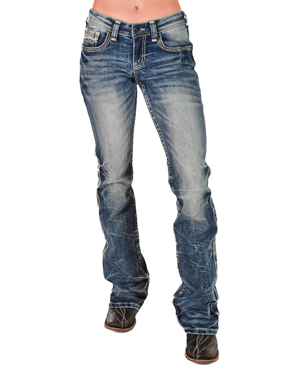 Cool meets classic in the Cool n Edgy Mid Rise Bootcut Jeans by Cowgirl Tuff. Designed for the rider who wants something rugged but polished, these jeans deliver an eye-catching wash and signature durability. The light-wash denim features a uniquely worn finish with natural-looking whiskering and fading that adds just the right touch of edge without going overboard.