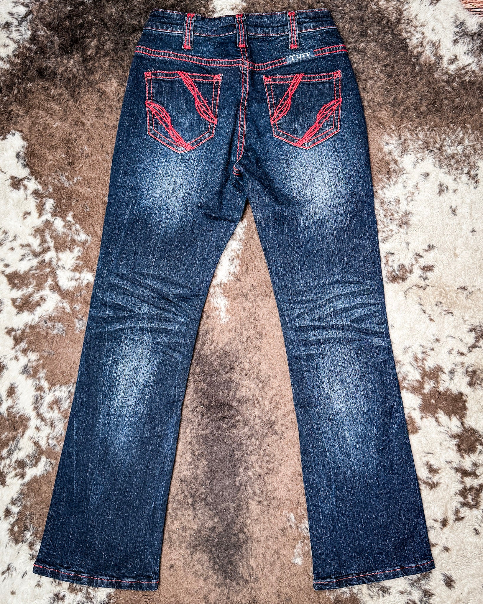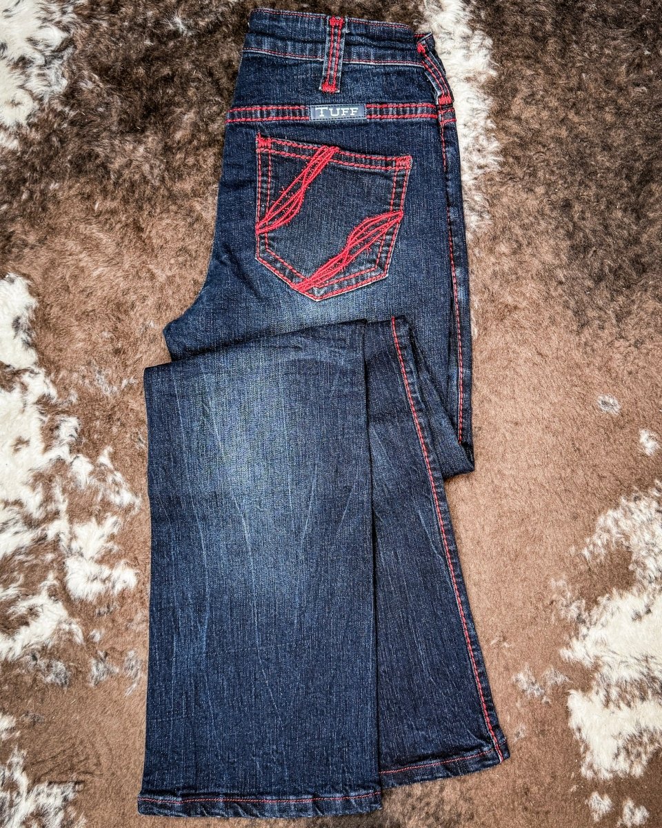 • Make a bold impression with the Cowgirl Tuff Ruby Bootcut Jeans, designed to stand out with rich red contrast stitching against a deep dark indigo wash. These jeans blend fashion-forward detail with the trusted comfort and durability you expect from Cowgirl Tuff. Made from premium 12 oz Tuff Flex denim, they offer a medium stretch that moves with you while maintaining their shape. The natural waistline gives a flattering silhouette, and the bootcut leg fits perfectly over your favorite western boots.