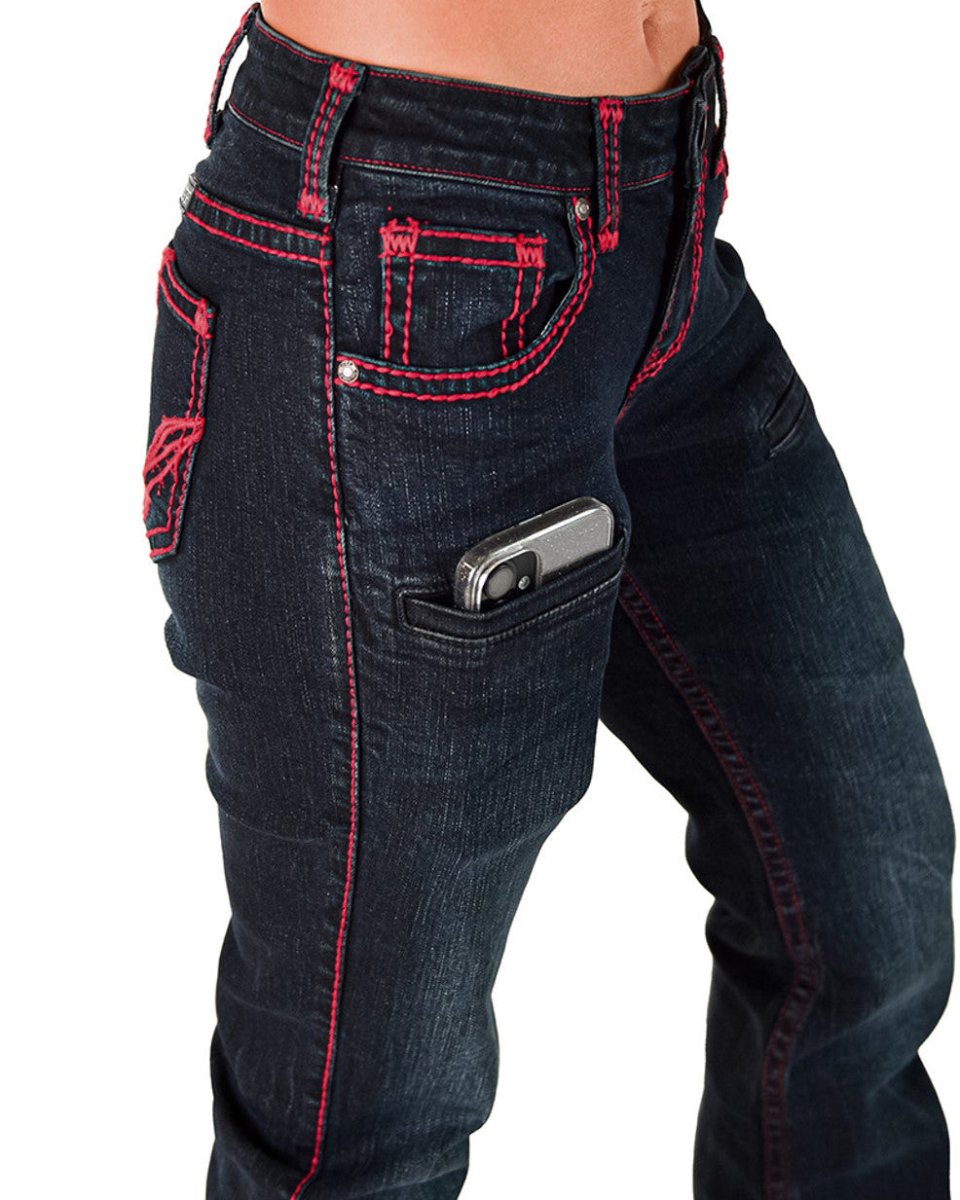 Whether you’re headed to the arena, a night out, or just love a strong denim game, the Ruby jeans are here to deliver. Two offset cellphone pockets add function without sacrificing form, while the pop of red thread gives your denim drawer something totally fresh. Pair them with a graphic tee or classic pearl snap for an effortlessly styled look.