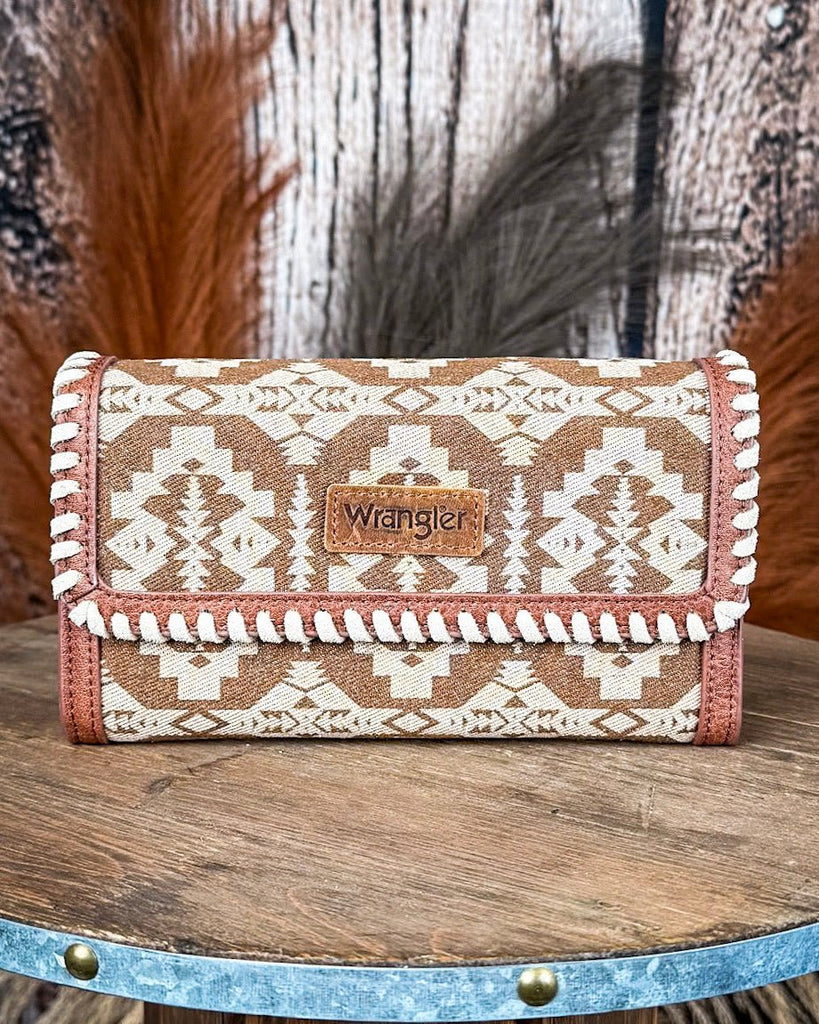 Bring a touch of the Southwest to your everyday look with the Wrangler Desert Dawn Aztec Canvas Wristlet. This stylish wristlet features a tan and cream Aztec design with rich brown faux leather trim and whipstitch detailing for a handcrafted western feel.