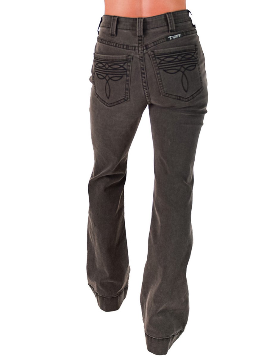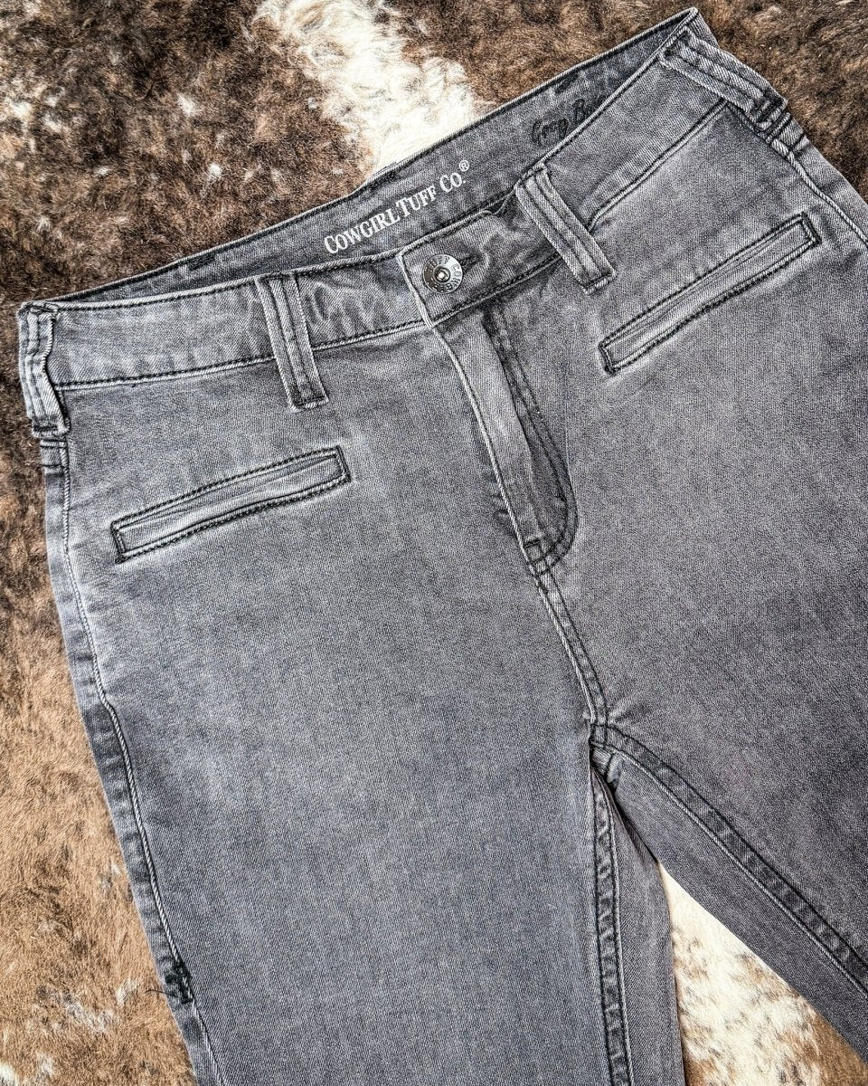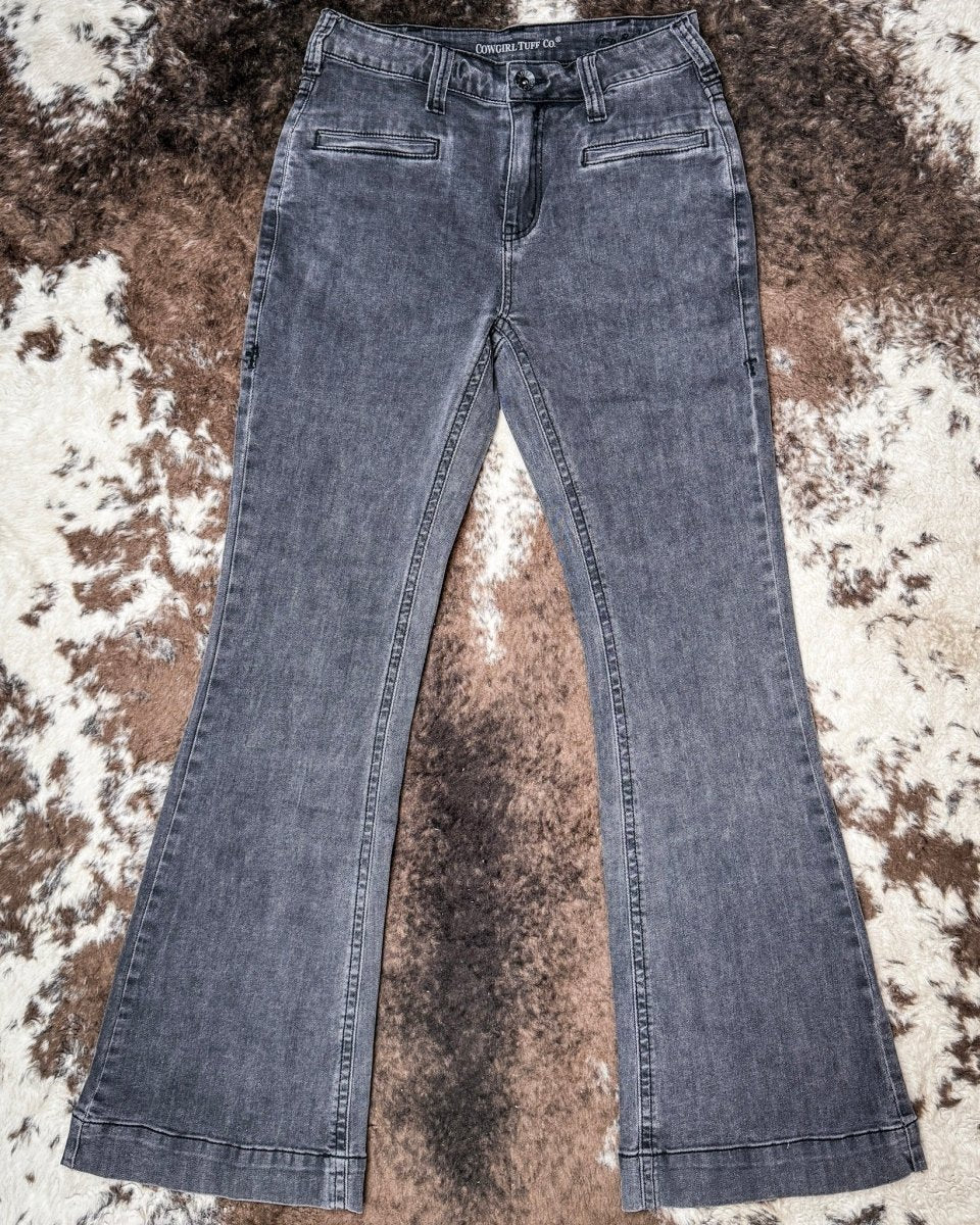 Take your denim game to a whole new level with the Gray Bootstitch Trouser Jeans by Cowgirl Tuff. These high-rise trousers are crafted from premium Tuff Flex denim with a medium stretch that hugs and flatters every curve. The deep gray wash is the perfect neutral shade for the season, and the black bootstitch embroidery on the back pockets adds just the right amount of edge and western appeal. Built for both function and fashion, these jeans feature a wide 2" cuffed hem and a sleek silhouette that pairs effortlessly with everything from classic button-ups to graphic tees.