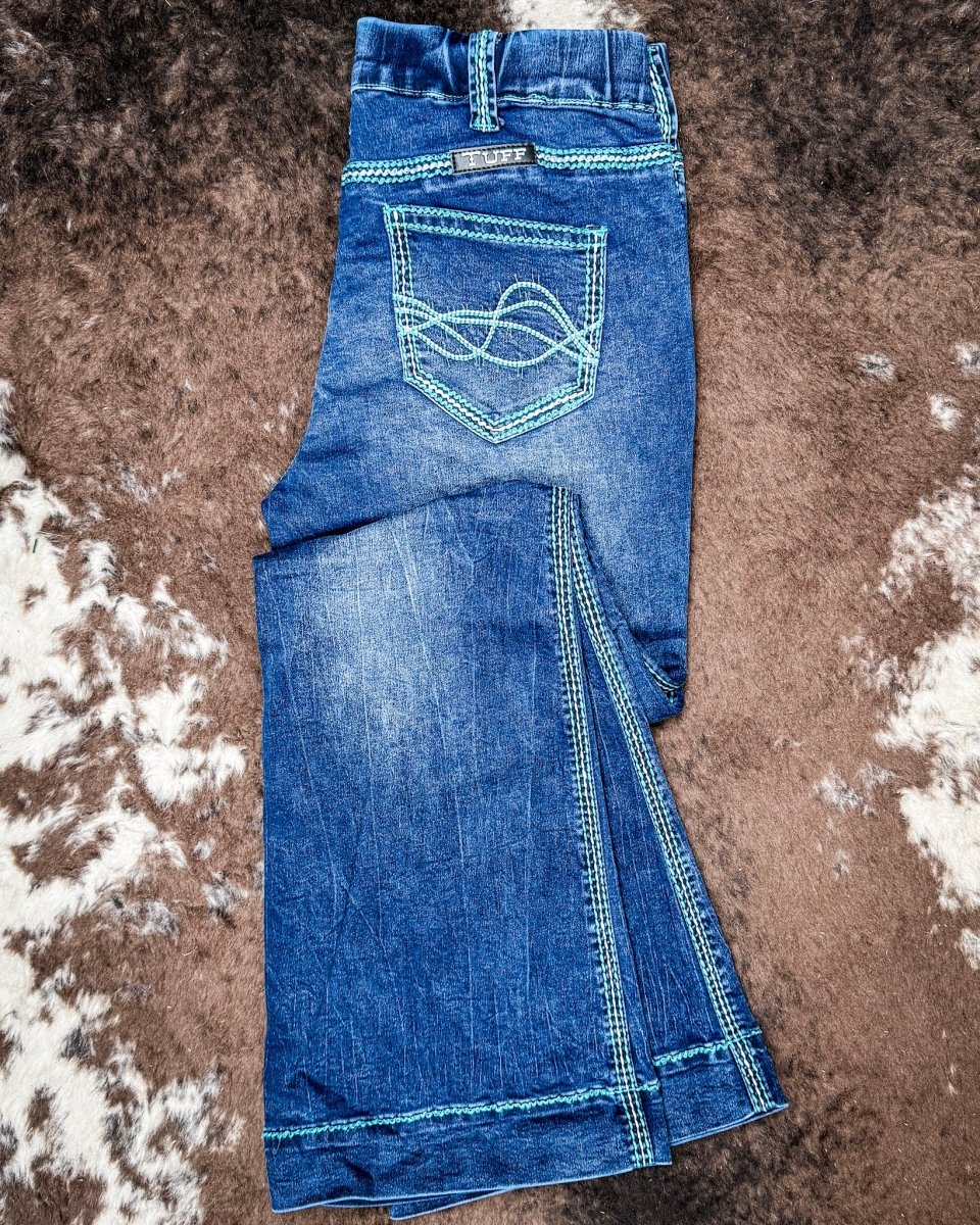 Slip into comfort and standout style with the Cowgirl Tuff Pull-On Turquoise Hurricane Trouser Jeans. These natural waist pull-on jeans are perfect for turquoise lovers who want a no-fuss fit without compromising bold western charm. Designed in a hurricane medium wash with triple-stitched turquoise and white seams, these jeans are made to flatter with just the right amount of stretch and structure.