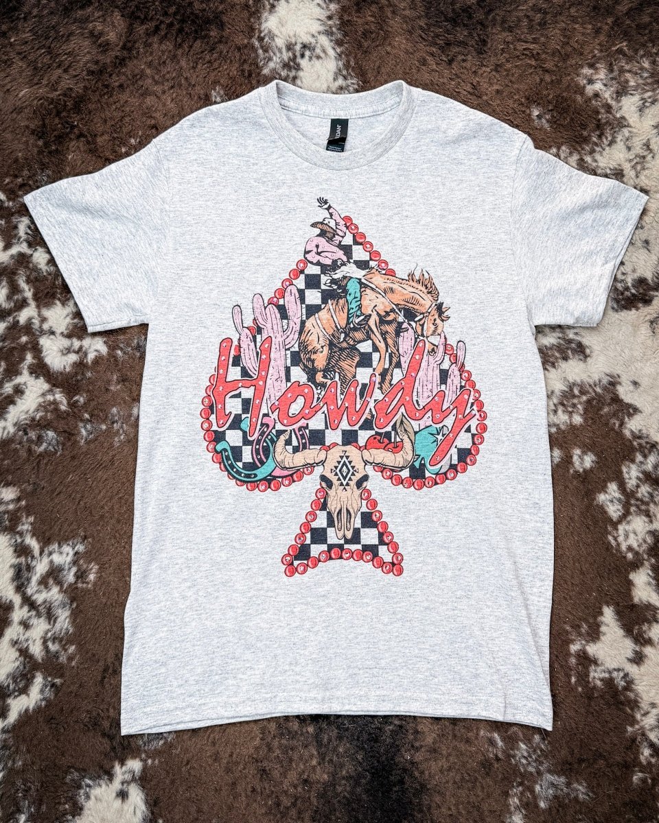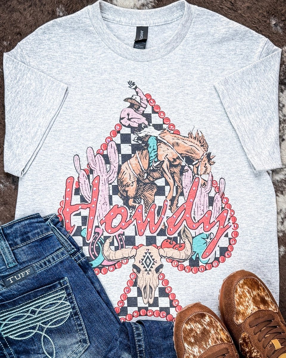 This rhinestone Howdy graphic tee blends bold western energy with a refined boutique finish. Set on a soft gray base, the design features a striking Howdy script layered over a checkered backdrop, framed inside a statement spade silhouette for a bold, eye catching shape. A dynamic bucking bronc rider crowns the top, while a detailed longhorn skull anchors the bottom for balanced western detail.