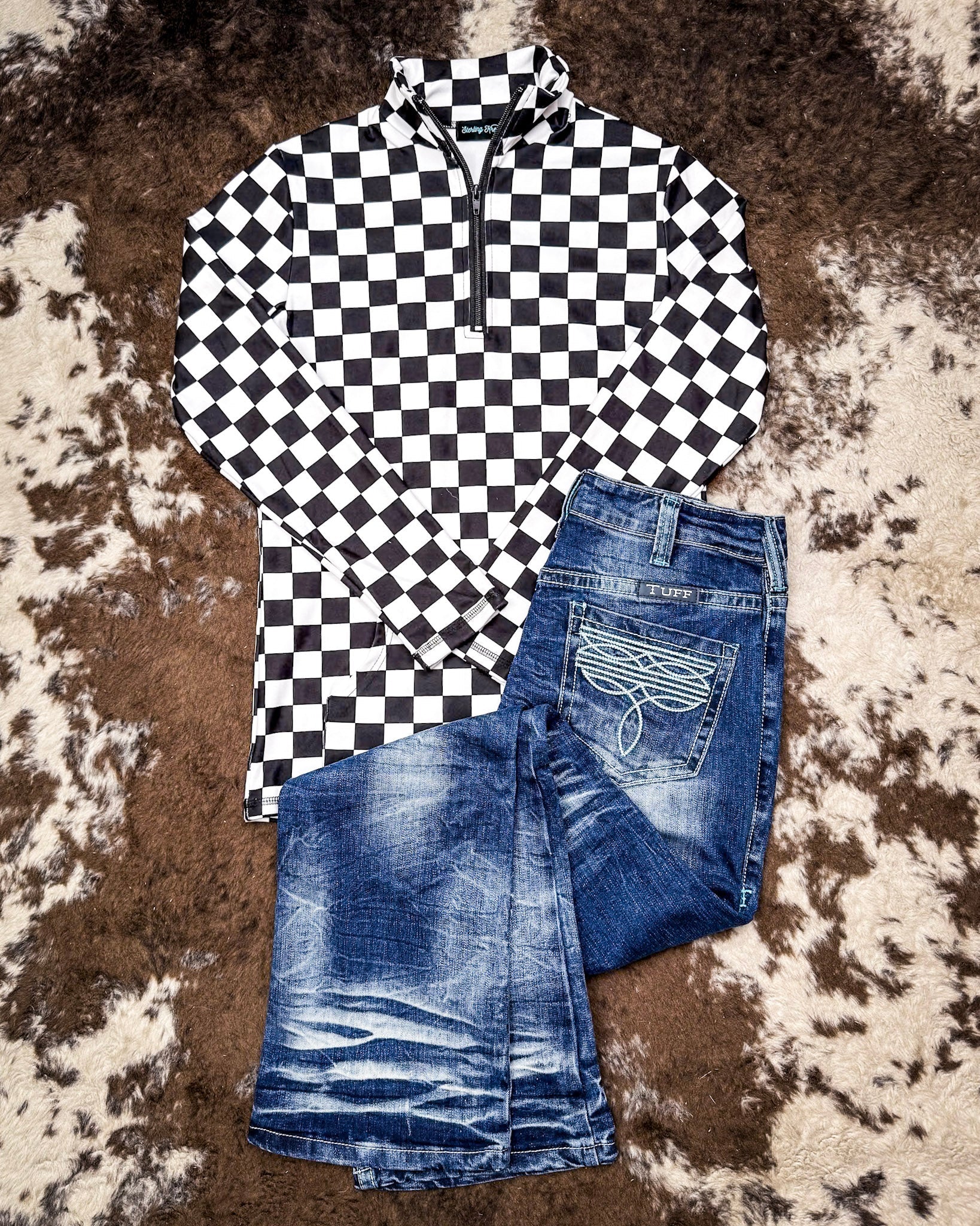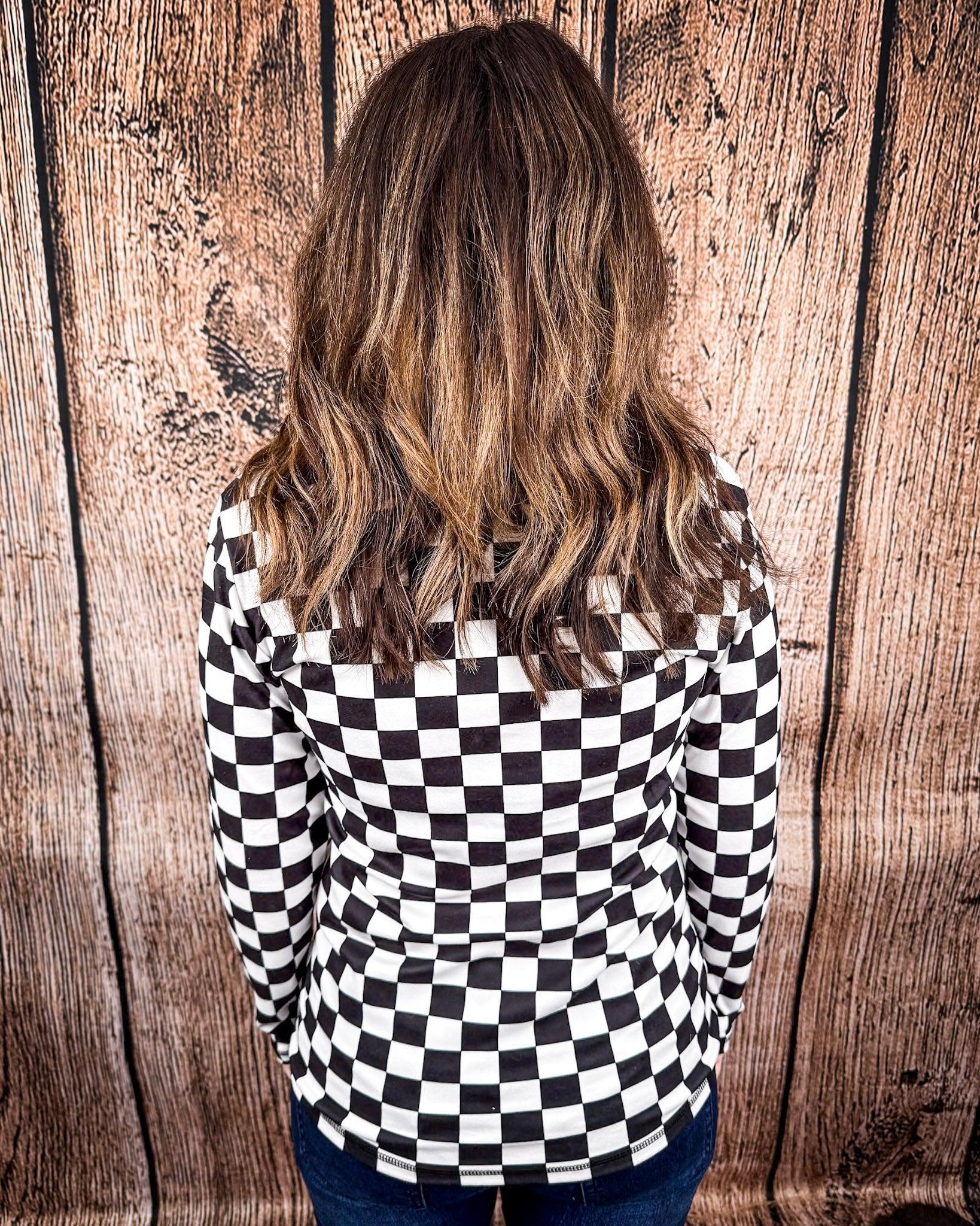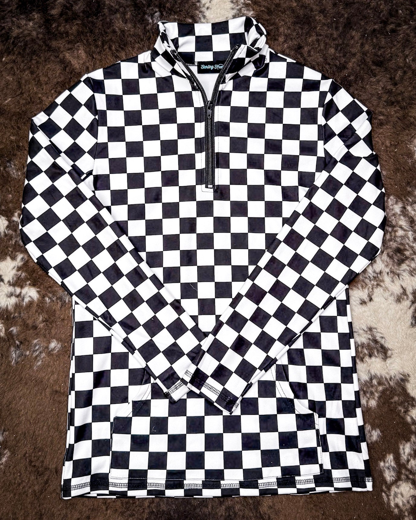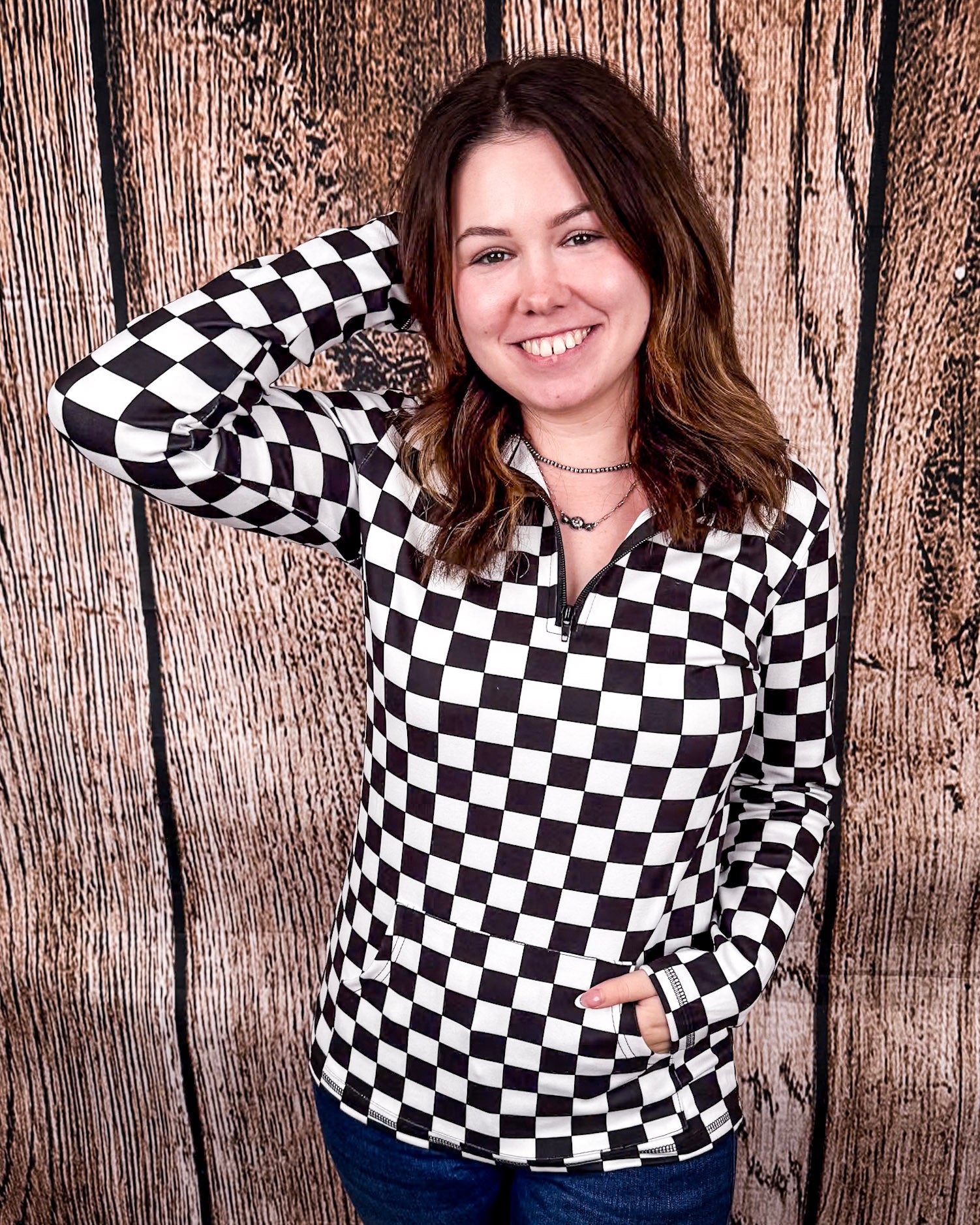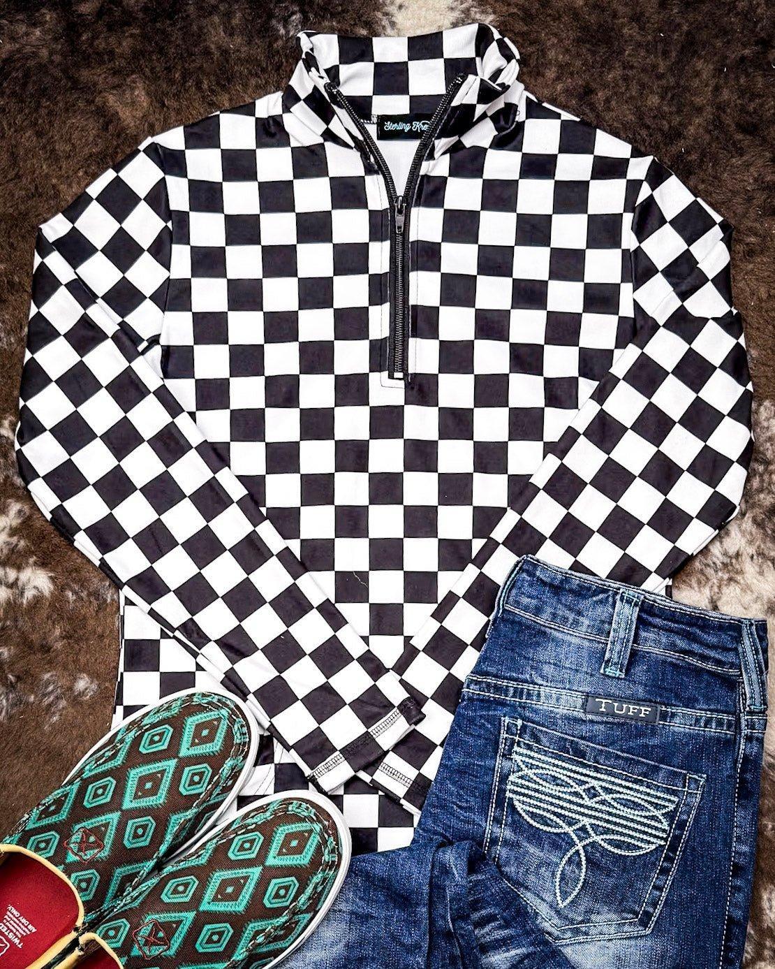 • Step into style that’s bold, playful, and effortlessly cool with the Round the Track Fitted Pullover by Sterling Kreek. Designed with a classic black-and-white checkered print, this pullover brings race-day energy into everyday fashion.