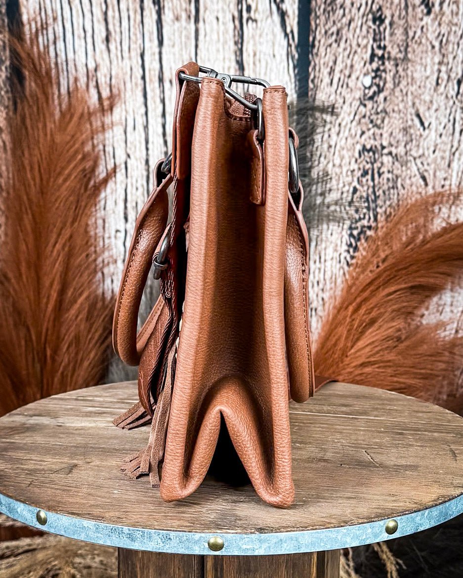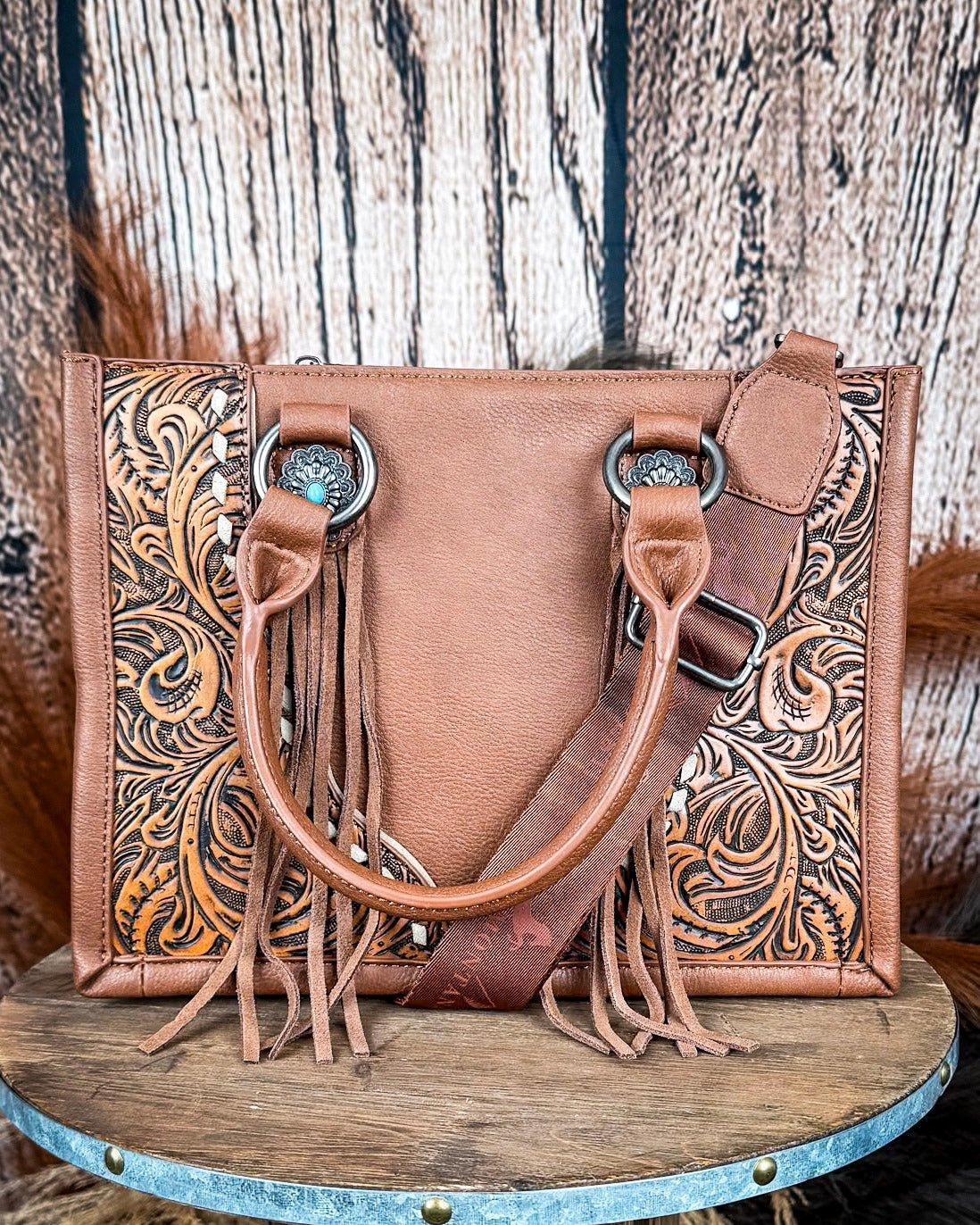 The Canyon Nights Tooled Fringe Satchel in Brown by Montana West brings bold texture and western artistry together in a structured silhouette. Featuring floral tooled panels, concho accents, and double fringe detailing, this satchel is eye-catching and functional. A detachable logo strap adds everyday ease, while the top handles offer classic carry versatility.