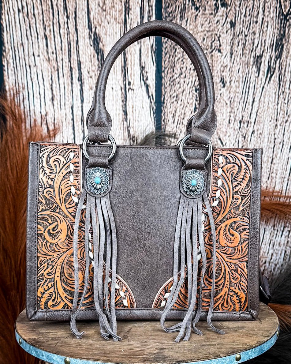 The Canyon Nights Tooled Fringe Satchel in Coffee by Montana West delivers rich depth and western flair in a structured carry-all silhouette. Intricately tooled floral panels are accented by flowing fringe and faux turquoise conchos for a bold-yet-polished finish. With a detachable logo strap and top handles, it's designed for versatility from day to night.