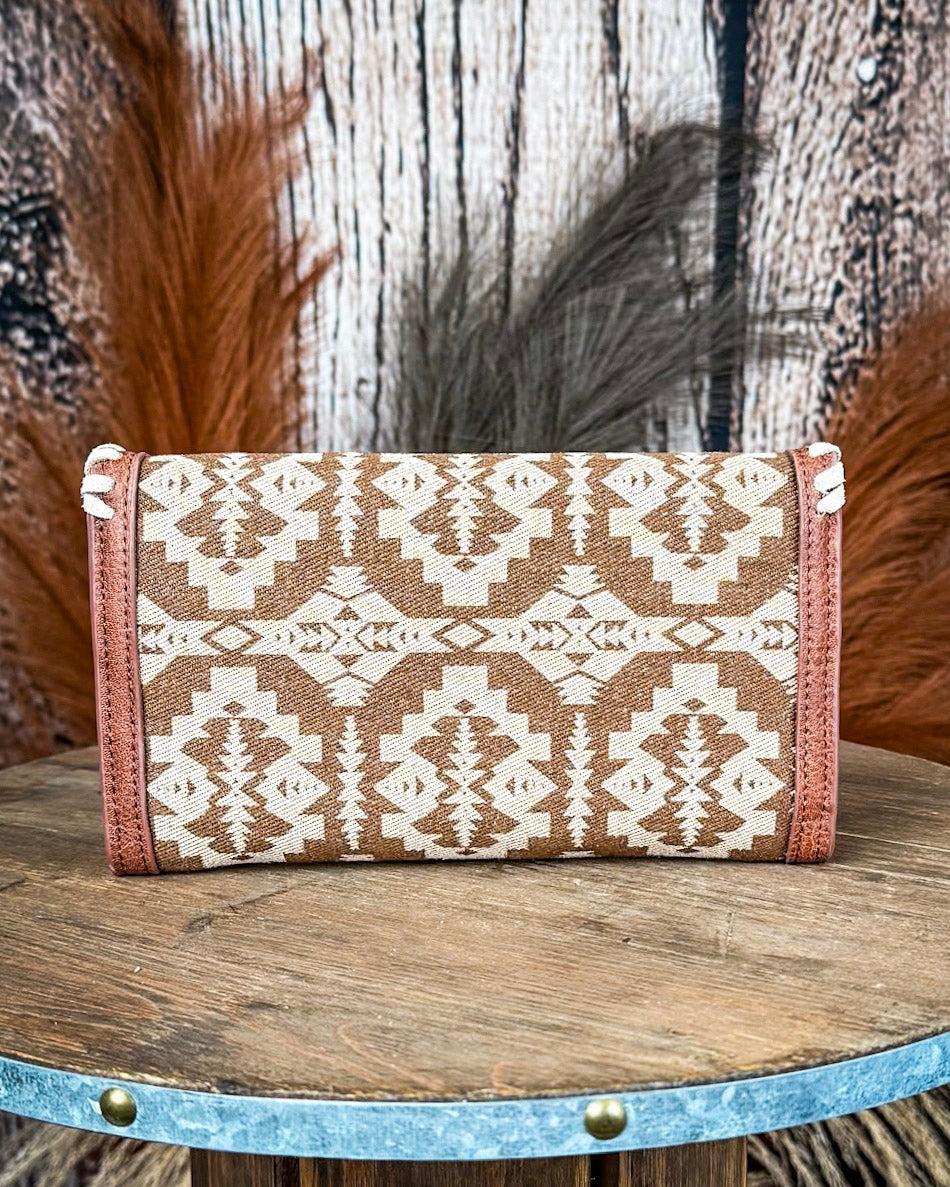 Bring a touch of the Southwest to your everyday look with the Wrangler Desert Dawn Aztec Canvas Wristlet. This stylish wristlet features a tan and cream Aztec design with rich brown faux leather trim and whipstitch detailing for a handcrafted western feel.