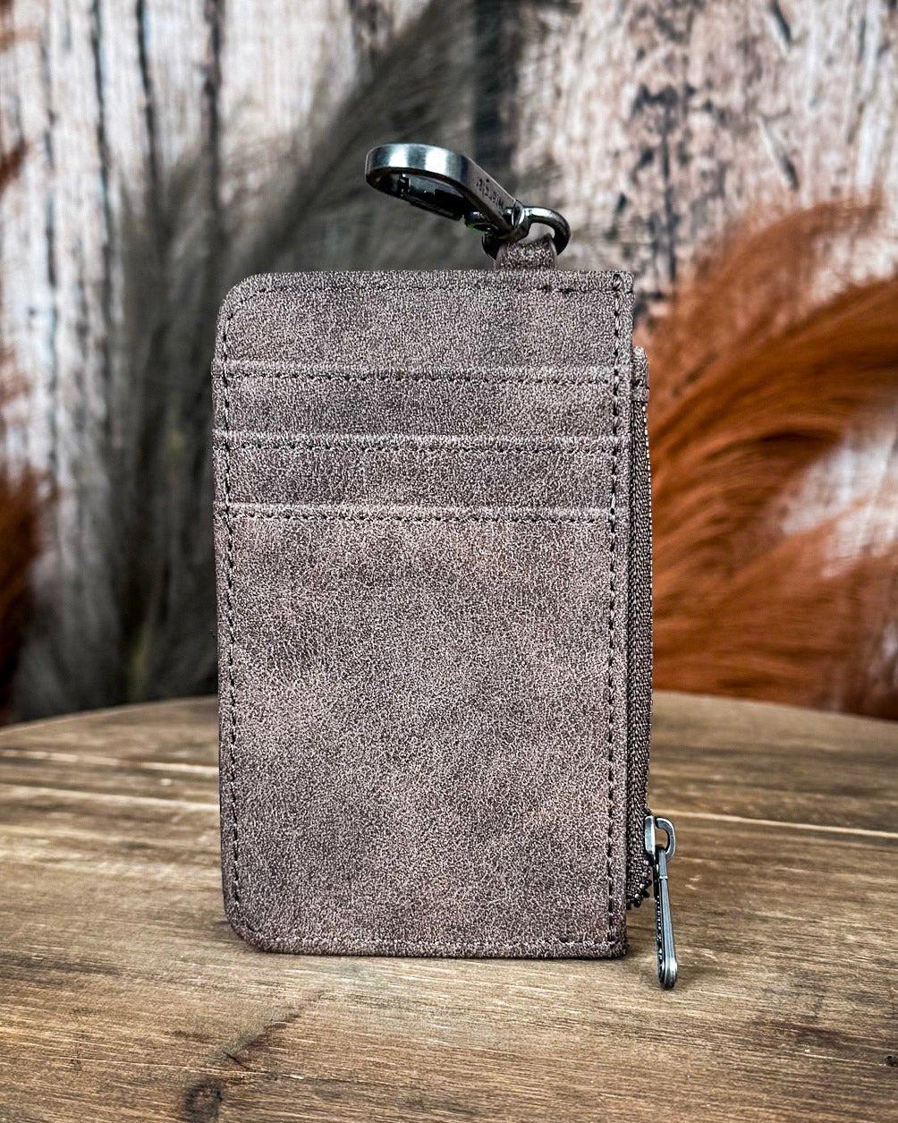Add a touch of the wild west to your everyday carry with the Desert Sky Aztec Wristlet Wallet Set in Coffee by Wrangler. This stylish two-piece set includes a compact card holder and matching coin pouch, both attached to a detachable wristlet strap featuring a striking turquoise, brown, and cream Aztec pattern.