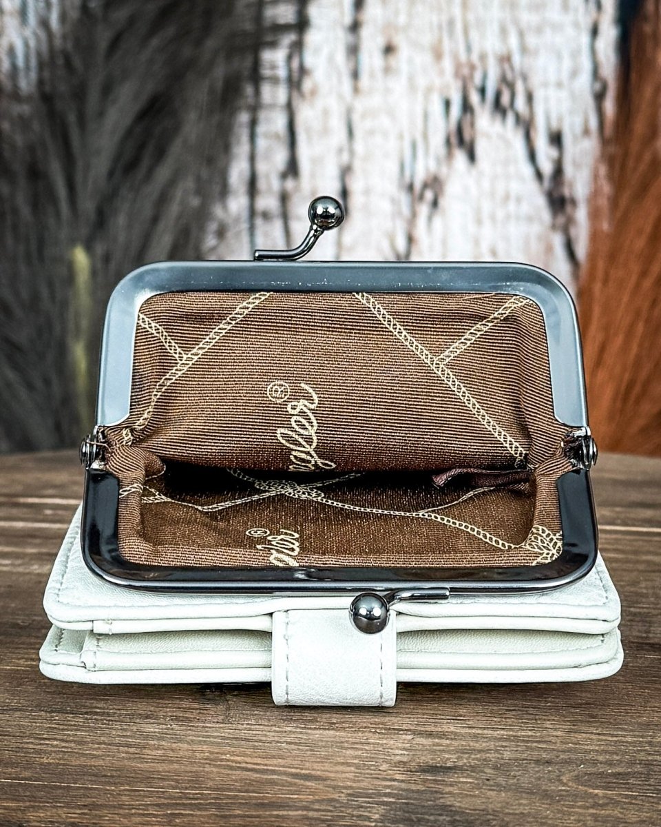 Inside, the Driftline is built for function. RFID protected, it includes eight card slots and one full-length bill slot to keep cards and cash organized. A kiss-lock coin purse on top adds a classic touch and provides a secure spot for change, keys, or small items. The compact silhouette makes this wallet ideal for days when you want to travel light without sacrificing storage or style. Whether you’re running errands, heading to work, or swapping between bags, this Wrangler wallet keeps everything streamlined and easy to find.
