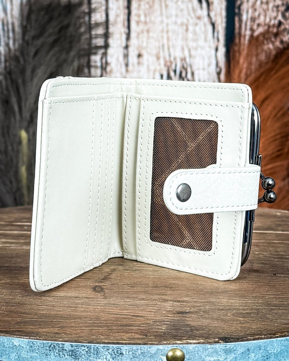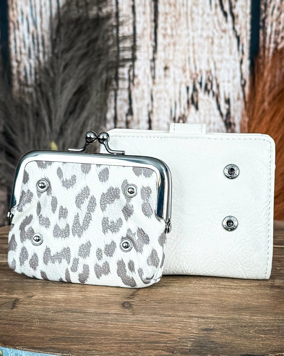 The Wrangler Driftline wallet delivers compact organization with a fun, neutral animal print that works for everyday carry. Made from smooth PU leather, this small bi-fold features a beige leopard print front accented with a stitched Wrangler logo patch for a clean, branded finish. The flap secures with a snap closure, keeping your essentials neatly tucked away while still easy to access in smaller handbags, belt bags, or backpacks.