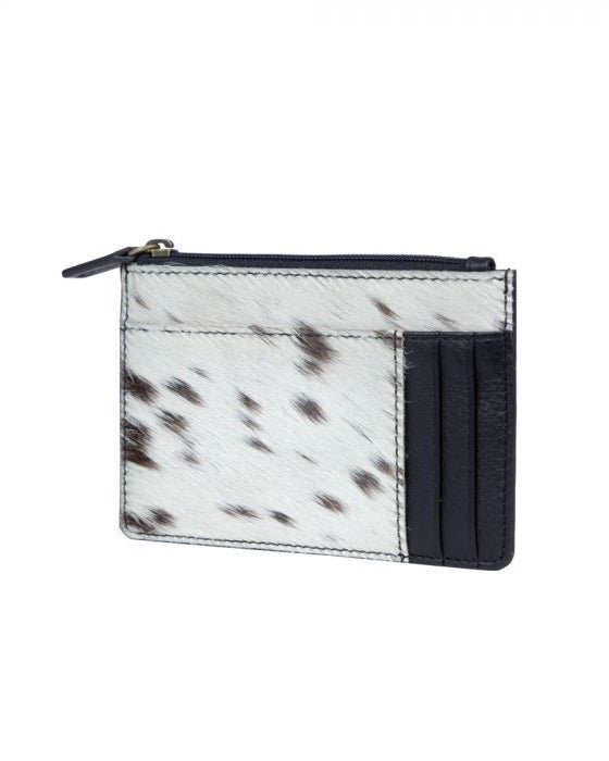 Crafted with genuine hair-on-hide and full-grain leather, this card holder is the perfect blend of bold and practical. The front showcases natural hide in deep chocolate browns and creamy whites, stitched clean with strong edges and a confident silhouette. It’s rustic, refined, and full of character—and just like a good pair of boots, it only gets better with age.