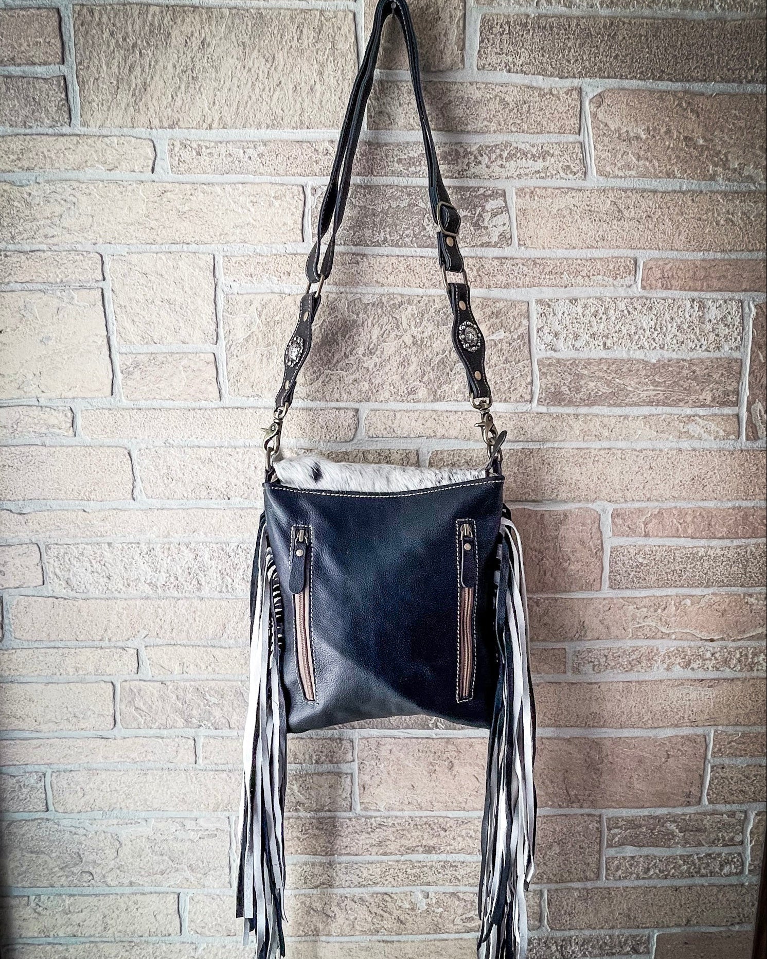 Crafted from genuine hair-on-hide with a distressed leather front flap and a unique angled design, this bag brings major attitude in all the best ways. The black and white hide contrasts perfectly with the rustic leather accents, while the layered fringe on both sides adds a dynamic sense of movement that turns every step into a strut.